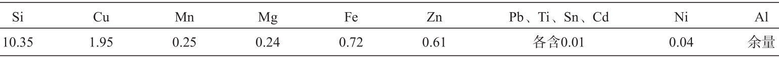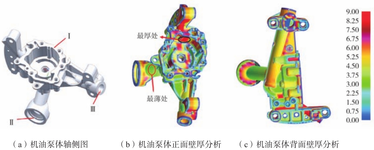 圖1 機(jī)油泵體三維模型及其壁厚分析 該機(jī)油泵體鑄件結(jié)構(gòu)不規(guī)則,壁厚不均勻,密封區(qū)域最大壁厚達(dá)13.6 mm,最薄壁厚僅1.5 mm,平均壁厚約4.5 mm。根據(jù)鑄件結(jié)構(gòu)及壓鑄經(jīng)驗(yàn)公式,可初步確定該鑄件工藝參數(shù)為:澆注溫度660 ℃、模具溫度210 ℃、慢/快壓射距離195 mm/65 mm、快壓射速度為2.75 m/s、慢壓射速度為0.25 m/s。 由于ADC12合金具有鑄造性能好、強(qiáng)度高、密度低和收縮率低等優(yōu)點(diǎn),機(jī)油泵體鑄件材料選用該合金,其合金成分見表1。