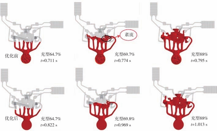 表5 方差分析結(jié)果 2.3.2 壓鑄充型及凝固分析 選取上述最佳的壓鑄工藝參數(shù)和優(yōu)化前的參數(shù),分別在Procast中進(jìn)行模擬,優(yōu)化前后的總充型時(shí)間分別為0.802 s和1.002 s,其充型過程如圖4所示。由圖4可見,在優(yōu)化前的充型過程中,當(dāng)?shù)谝还山饘僖和ㄟ^內(nèi)澆道(慢壓距離195 mm)時(shí)開始進(jìn)入快速壓射階段,金屬液流動速度陡然增大,以極大地速度從內(nèi)澆道噴射并撞擊型芯和型腔壁,對模具有猛烈地沖刷,不僅會產(chǎn)生飛濺,也會縮短模具的壽命。充填69.7%時(shí),經(jīng)過鑄件右側(cè)兩路澆道的金屬液以很大地速度在鑄件壁厚最大處匯合,兩股金屬液相互撞擊,形成紊流而卷入大量氣體使金屬液氧化而降低補(bǔ)縮能力,增加了縮松縮孔形成的傾向。加之鑄件此處壁厚最大,冷卻過程散熱緩慢易形成孤立液相區(qū)造成排氣困難,進(jìn)一步增大了形成孔隙的可能。 優(yōu)化后充型過程的慢壓射速度小,慢壓時(shí)壓射沖頭以較小的速度運(yùn)動,金屬液在壓室中平靜流動并以層流的方式緩慢填充型腔,不會卷入大量的空氣。同時(shí)較小的慢壓速度和較長的慢壓距離對應(yīng)著較長的慢壓時(shí)間,填充過程型腔中的氣體有更多的時(shí)間排除,降低了鑄件出現(xiàn)孔隙的概率。優(yōu)化后的慢壓射行程為200 mm,金屬液以慢壓射速度通過內(nèi)澆道充填型腔體積(包括鑄件、溢流及排氣系統(tǒng))的約15%時(shí)進(jìn)入快速壓射階段,進(jìn)入型腔的前部分金屬液緩慢填充,后面快速填充部分的金屬液有前部分金屬液作為緩沖而減小對模具的直接沖擊,從而可延長模具壽命。充填69.8%的同時(shí),在鑄件最大壁厚處匯合的兩股金屬液速度較小,不會猛烈地相互擾動而形成嚴(yán)重紊流,減小鑄件形成孔隙的傾向。
