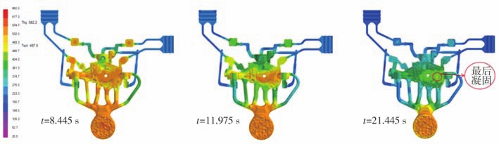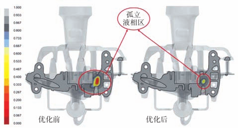圖5 鑄件凝固過程 ACD12鋁合金的臨界補(bǔ)縮固相率為0.7,通常認(rèn)為鑄件凝固分?jǐn)?shù)大于70%后,金屬液不再具有宏觀補(bǔ)縮能力。當(dāng)鑄件凝固分?jǐn)?shù)為70%時(shí),對優(yōu)化前后工藝方案鑄件最后凝固的區(qū)域進(jìn)行比較分析,如圖6所示。