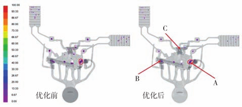 圖6 工藝優(yōu)化前后鑄件最大壁厚處孤立液相區(qū)對比 優(yōu)化前后鑄件該區(qū)域固相率都低于100%,且溫度高于鑄件周圍溫度,這進(jìn)一步證明鑄件此處出現(xiàn)了孤立液相區(qū)。但優(yōu)化后孤立液相區(qū)截面面積明顯小于優(yōu)化前,說明工藝參數(shù)優(yōu)化對鑄件收縮缺陷有顯著地改善作用。 如圖7所示,凝固過程數(shù)值模擬結(jié)果顯示,鑄件縮松縮孔主要分布于最大壁厚A處和復(fù)雜位置B處,而薄壁區(qū)域C處無明顯分布。由圖7可知,優(yōu)化后鑄件整體縮松縮孔缺陷明顯減少,優(yōu)化前鑄件最大壁厚A處出現(xiàn)了單個(gè)最大的縮孔指標(biāo)體積為0.988 cm³,概率為48.14%,很可能形成收縮缺陷。優(yōu)化后A處指標(biāo)體積為0.762 cm³,概率為24.65%,形成收縮缺陷概率降低。優(yōu)化后鑄件整體和壁厚最大處出現(xiàn)收縮缺陷的體積和概率較優(yōu)化前均有減少。優(yōu)化前后鑄件整體縮松縮孔指標(biāo)體積分別為1.452 cm³ 和1.067 cm³,優(yōu)化后較優(yōu)化前縮松縮孔缺陷指標(biāo)體積降低了26.5%。