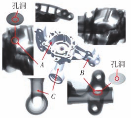 圖8 壓鑄生產(chǎn) 為檢驗(yàn)鑄件內(nèi)部質(zhì)量,對其進(jìn)行X射線探傷,結(jié)果如圖9所示。對比圖9的探傷結(jié)果與圖7數(shù)值模擬預(yù)測結(jié)果,可以看出機(jī)油泵體鑄件產(chǎn)生縮松縮孔的位置與預(yù)測結(jié)果基本一致,這說明模擬試驗(yàn)的預(yù)測結(jié)果是比較準(zhǔn)確的。鑄件產(chǎn)生微小縮孔的位置如圖9中A、B兩處,這兩處位置均為鑄件偏外側(cè)區(qū)域,對機(jī)油泵體的密封性幾乎沒有影響。在生產(chǎn)中,采取適當(dāng)點(diǎn)冷措施增大此處的冷卻速率,可降低孔洞發(fā)生的概率。