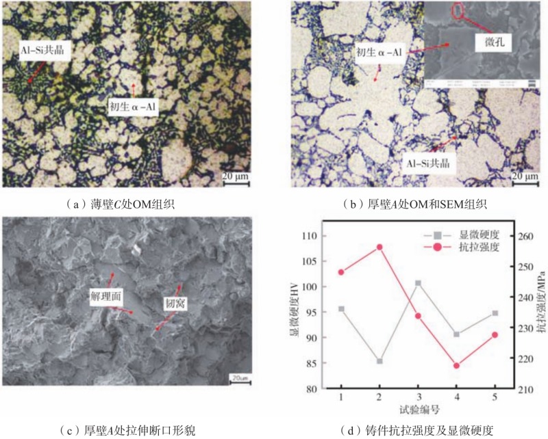 圖10 機(jī)油泵體鑄件OM、SEM組織、拉伸斷口形貌、抗拉強(qiáng)度及顯微硬度