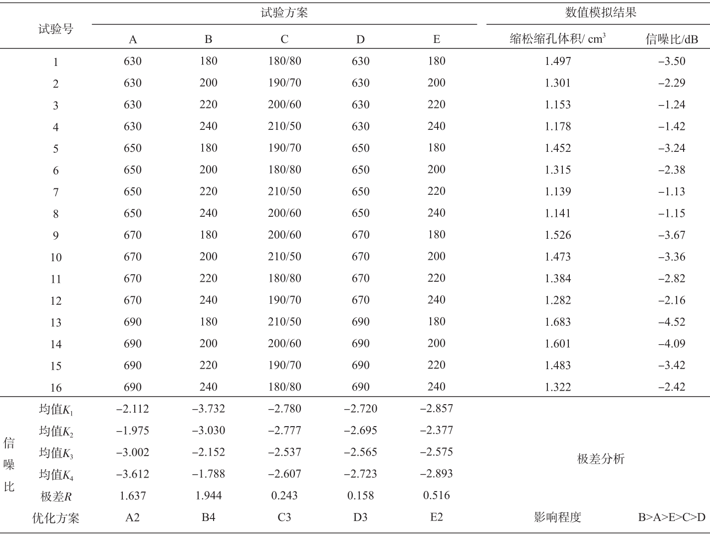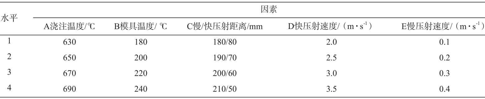 表2 澆排系統(tǒng)主要參數(shù) 2、壓鑄參數(shù)正交設(shè)計(jì)及工藝參數(shù)優(yōu)化 2.1 壓鑄數(shù)值模擬初始及邊界條件 在保證數(shù)值模擬結(jié)果可靠的前提下,盡可能減少計(jì)算時(shí)間,本研究采用Procast軟件,劃分非均勻網(wǎng)格。將鑄件、澆注系統(tǒng)及排溢系統(tǒng)等金屬液填充區(qū)域壁厚較薄處的網(wǎng)格單元尺寸設(shè)置為1.5 mm,其他區(qū)域網(wǎng)格單元尺寸設(shè)為3 mm,模具、料筒及沖頭等金屬部件的網(wǎng)格單元尺寸設(shè)為10 mm,網(wǎng)格總數(shù)量約454萬個(gè)。鑄件材料為ADC12鋁合金,模具材料為H13熱作模具鋼,材料的初始條件與文獻(xiàn)相同。 2.2 壓鑄數(shù)值模擬方案及結(jié)果 機(jī)油泵體鑄件對內(nèi)部質(zhì)量及氣密性要求高,鑄件內(nèi)部不允許有裂紋、疏松、氣泡等缺陷。影響壓鑄質(zhì)量的因素眾多,相關(guān)生產(chǎn)實(shí)踐及文獻(xiàn)研究表明,對缸體類壓鑄件的成形質(zhì)量有著重要影響的工藝參數(shù)是澆注溫度(A)、模具工作溫度(B)、慢/快壓射距離(C)、快壓射速度(D)和慢壓射速度(E),因而本文正交試驗(yàn)選擇這5個(gè)參數(shù)作為縮松縮孔缺陷的影響因素,其他參數(shù)按照實(shí)踐生產(chǎn)情況設(shè)定為某個(gè)定值,暫不考慮其影響。5因素4水平正交試驗(yàn)參數(shù)擬定如表3所示。