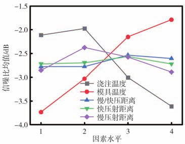 式中:S/N為信噪比;yi 為第i次試驗(yàn)結(jié)果,n為試驗(yàn)次數(shù)。 表4的下部分為機(jī)油泵體鑄件縮松縮孔體積對應(yīng)信噪比的極差表,Ki 為不同因素第i水平下所有縮孔體積信噪比的平均值。圖3為鑄件的各因素水平與縮松縮孔體積信噪比均值的折線圖,比極差表折線圖能更加直觀地反應(yīng)各因素對鑄件縮松縮孔體積的影響情況。