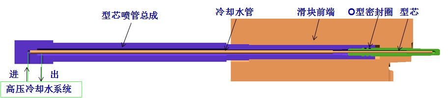 圖5 左滑塊優化方案結構圖 異型部位采用鑲件結構,內部加設Φ7 mm冷卻水道。采用噴管式獨立水冷卻,內置不銹鋼噴管Φ4 mm,內孔進水,外壁回水,見圖6。