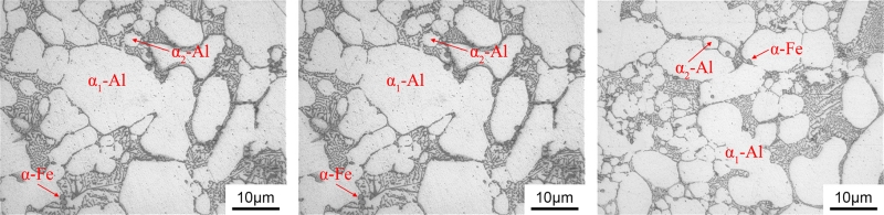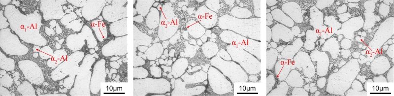 (a)1號 (b)2號 (c)3號 可以看出,3組合金的鑄態組織主要由α-Al及Al-Si共晶相組成。其中α-Al晶粒有兩種類型,分別標記為α1-Al和α2-Al。這是因為壓鑄凝固過程是一個兩階段過程,當熔化后的鋁液倒入壓室,壓室內相對較低的溫度能夠將鋁液冷卻至液相線溫度以下,此時α1-Al晶粒在壓室中開始形核并生長,因此也被稱為壓室預結晶。這些晶粒伴隨著未凝固鋁液一同進入模具型腔,因為有充足時間長大,造成最終尺寸較粗大。在模具型腔填充過程中,由于冷卻速率非常快,因此形成了更細小、形狀也更為圓整的α2-Al晶粒。經Sr元素變質后的共晶Si呈纖維狀,同時在共晶區存在呈現出多邊形的富Fe相,通過EDS能譜分析確認其為α-Fe相。