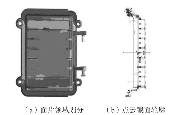 圖3 點云數據處理效果 2.2 模型重構 在逆向工程中,模型的構建是利用點云數據重建為實體的過程。系統根據點云的曲率和幾何特征將表面劃分為多塊領域,并用不同顏色區分,見圖4a。為建立操作平面,方便平移、旋轉及快速切換視圖和確定位置等各種操作,采用圓心結合平面的方式與系統坐標對齊。隨后使用“面片草圖”功能獲取零件截面數據,進行草圖的編輯與修改,生成封閉截面,見圖4b。