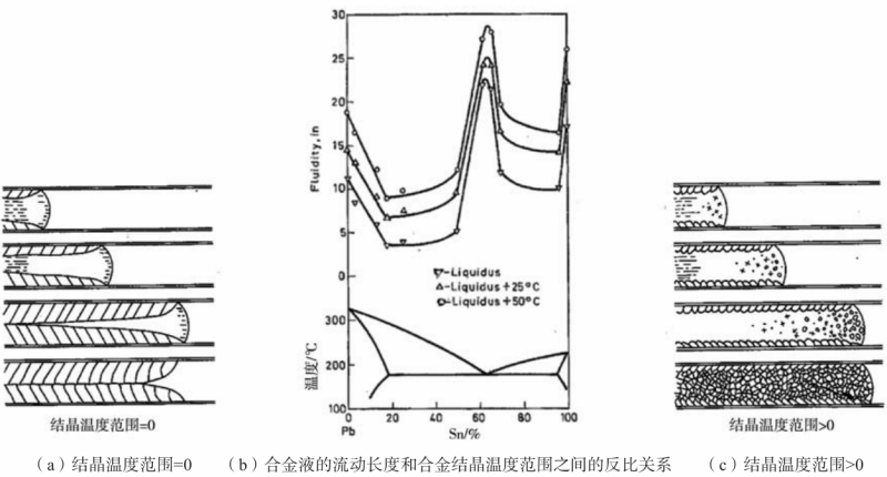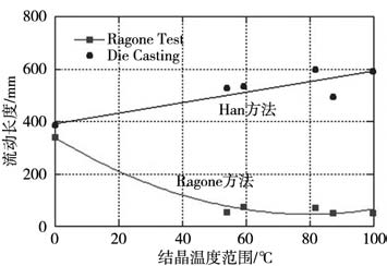 圖2 Ragone試驗法和Han試驗法制備的壓鑄件 2 試驗結(jié)果及分析 2.1 流動性和合金間隔的關(guān)系 用表1所列合金實測了兩種鑄造條件下的流動長度,所測得的流動長度和合金的結(jié)晶溫度范圍之間的關(guān)系見圖3。用Ragone方法獲得的試驗數(shù)據(jù),呈現(xiàn)出合金流動性和合金結(jié)晶溫度范圍之間的反比關(guān)系,與圖1所示的著名試驗結(jié)果一致。試驗結(jié)果表明,在重力鑄造條件下,麻省理工的流頭阻塞理論,不僅適用于如圖1所示的二組元合金,也適用于多組元商業(yè)合金。 然而,圖1所示的壓鑄條件下的流動性和結(jié)晶溫度范圍的規(guī)律與重力鑄造條件下的規(guī)律完全相反。使用Han方法所獲得的壓鑄條件下試驗數(shù)據(jù)如圖3所示,合金的流動性隨合金的結(jié)晶溫度范圍增加而增加,這一趨勢與重力鑄造條件下的趨勢完全不同。例如,純鋁(結(jié)晶溫度范圍等于0)在重力鑄造條件下的流動性應(yīng)該優(yōu)于結(jié)晶溫度范圍大于0的合金,但在壓鑄條件下,其流動性反而低于結(jié)晶溫度范圍大于0的合金。為此,圖3所示的試驗結(jié)果預(yù)示著壓鑄條件下金屬液充型流動的停止機理與重力鑄造條件下的流動停止機理存在不同之處。