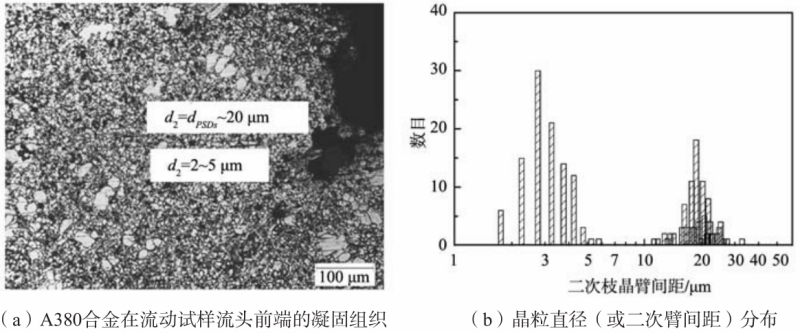 表3 二次枝晶臂間距和用公式(2)和(3)計算的局部凝固時間以及平均冷卻速度 2.4 A380 合金在壓鑄件中的枝晶形貌 在壓鑄過程中,當金屬液澆入壓室后受壓室急冷,開始形成一些鋁枝晶。這些枝晶通常稱為預(yù)結(jié)晶枝晶(pre-solidified dendrites,PSDs)或外生晶(Externally Solidified Crystals,ESCs)。然后,含有一定數(shù)量預(yù)結(jié)晶枝晶的金屬液被壓頭在一定的速度和壓力控制下壓入鑄型充型。這些預(yù)結(jié)晶枝晶的生長受壓頭推進所帶來的液態(tài)擾動影響,其晶體形貌介于圖5所示的形貌之間。 壓鑄件流動性試樣接近流頭的典型凝固組織見圖6a,存在兩類白色的枝晶組織。這兩類枝晶組織的尺寸呈雙峰分布,見圖6b。較大枝晶的直徑約20 μm,與圖5中的枝晶尺寸數(shù)量級接近。顯然,這些晶粒是壓室中形成的枝晶碎片,是預(yù)結(jié)晶枝晶或外生晶。較小晶粒的直徑約2~5 μm。部分小晶粒呈現(xiàn)一次枝晶臂及其整齊排列的二次枝晶臂,二次枝晶臂間距約2~5 μm。這些較小的晶粒應(yīng)該是金屬液在鑄型中快冷所形成的枝晶組織。盡管圖5中的預(yù)結(jié)晶枝晶或外生晶的分布比較均勻,但是,這些預(yù)結(jié)晶枝晶在鑄件某些部位的分布極不均勻。
