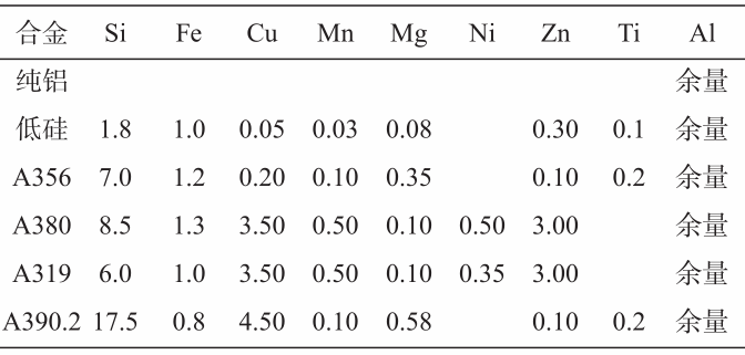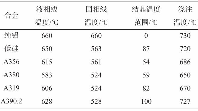 圖1 合金的流動性和相圖的關(guān)系以及流頭阻塞機理 然而流頭阻塞理論顯然不適用于描述壓鑄條件下的合金流動性問題。其一,半固態(tài)合金可在固相分數(shù)大于0.5時壓鑄充型,遠遠大于流頭阻塞理論所提出的臨界固相分數(shù);其二,壓鑄的充型時間小于0.1 s,在這么短的充型時間內(nèi)流頭的溫降不大;其三,內(nèi)澆道合金液流速可大于50 m/s,在這么大的運動速度下,金屬液滴(包括已凝固成固相顆粒)也會在慣性作用下運動相當長的距離。為此,壓鑄條件下金屬液的流動性與流頭凝固現(xiàn)象相關(guān)性不大。作者發(fā)現(xiàn),壓鑄時的流動停止與在壓室中形成的預(yù)結(jié)晶枝晶堵塞內(nèi)澆道相關(guān)。本文簡述作者近年來在鋁合金壓鑄流動性方面的研究工。選用結(jié)晶溫度范圍變化較大的合金進行重力鑄造和壓鑄兩種條件下的合金流動性研究,驗證這些特定合金在這兩種不同鑄造條件下合金的流動性隨合金結(jié)晶溫度范圍的變化趨勢截然不同。通過壓鑄件的金相檢測,顯示壓鑄條件下合金液停止流動的物理機制。通過使用Darcy定律計算流動阻塞處的壓降,證明此壓降與壓頭壓強數(shù)量級相同,從而證明作者提出的壓鑄條件下的流動停止機理成立。 1 試驗過程 1.1 試驗合金及熔煉澆注 試驗選用的合金及其成分見表1。除4個商業(yè)合金外,選擇純鋁和低硅合金,使試驗合金的成分范圍增大,從而驗證麻省理工提出的流頭阻塞理論在重力鑄造和壓鑄條件下的可行性。為防止壓鑄金屬型粘模,將A356合金的含鐵量提高到A380合金的水平。試驗合金用10 kg電阻爐熔化,加熱到750 ℃,保溫30 min后,隨爐冷卻到澆注溫度。合金的澆注溫度選擇為高于該合金液相線70 ℃,即過熱度為70 ℃。使合金液在相同過熱度條件下充型,從而消除過熱度對合金流動性的影響。合金的液相線和固相線溫度用ThermoCalcTM和Al-3熱力學(xué)數(shù)據(jù)庫計算。表2列出表1中合金的液相線溫度、固相線溫度和結(jié)晶溫度范圍,并列出合金液的澆注溫度。