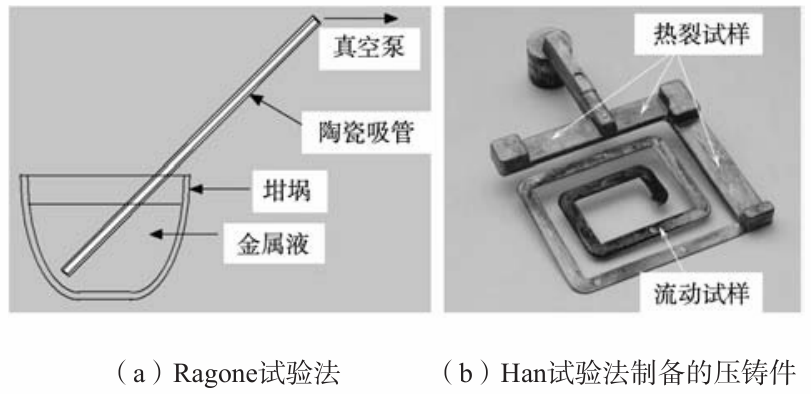 表2 試驗合金的液相線和固相線溫度,結(jié)晶溫度范圍和澆注溫度 1.2 流動性測試方法 使用了兩種方法測試合金的流動性。第一種是麻省理工開發(fā)的Ragone方法,見圖2a。合金液在表2給定的溫度下吸入內(nèi)徑4 mm室溫陶瓷管,真空泵的壓力控制在82 cm水柱。陶瓷吸管的水平度對試驗結(jié)果影響不大。詳細的Ragone試驗方法參見麻省理工已發(fā)表的文獻。Ragone方法被認為是在重力鑄造條件下研究合金流動性的最精確的方法。 第二種是作者在橡樹嶺實驗室開發(fā)的Han方法。作者使用一臺128 t鎖緊力的壓鑄機,用H13鋼模具制備如圖2b所示的壓鑄件。模溫130 ℃,壓室內(nèi)徑5.08 cm,壓頭最高速度254 cm/s,最大壓強13.8 MPa。詳細的壓鑄試驗條件參見作者已發(fā)表的文獻。鑄件由三段熱裂試樣和一段回形流動性試樣組成,可同時用于測定合金的熱裂傾向和流動性。熱裂試樣厚6 mm,寬32 mm,長分別為57 mm,76 mm,127 mm?;匦瘟鲃有栽嚇雍? mm,寬15 mm,長914 mm。熱裂試樣可視為壓鑄件的橫澆道,流動性試樣的入口可視為壓鑄件的內(nèi)澆道。回形的邊長隨合金液的充型流動而遞減。這樣的流動性試樣設(shè)計,使壓鑄條件下離散的流頭液滴獲得一定的形狀規(guī)范,從而減小離散流頭液滴由于與主流充型液流分離而帶來的流動長度測量誤差。然而,即使使用這樣的回形流動試樣,凝固后的流頭仍然極易在鑄件脫模時從鑄件本體脫落而成為碎片,帶來一定的試驗誤差。 1.3 壓室中的凝固組織模擬 在圖2b所示的熱裂試樣和流動試樣中,往往含有部分在壓室中形成的枝晶組織。為區(qū)別壓室內(nèi)形成的枝晶組織和鑄型內(nèi)形成的組織,選用A380鋁合金,在表2中的過熱度條件下,澆入與壓室內(nèi)徑相同的鋼管,開展了兩個凝固試驗,以揭示壓鑄條件下合金液流動停止機理。第一個是合金液自然凝固,以確定合金的二次枝晶臂間距。第二個是合金液在高強超聲攪拌作用條件下的凝固,近似模擬金屬液在壓室中受到強制擾動時破碎枝晶的形貌。詳細的試驗條件參見作者已發(fā)表的文獻。