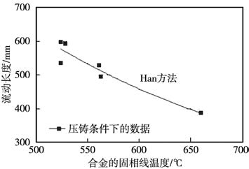 圖4 壓鑄條件下實測的合金流動長度與計算的合金固相線溫度之間的關(guān)系