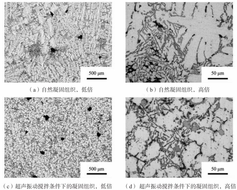 圖5 A380合金在壓室中自然凝固組織以及在超聲振動攪拌條件下的凝固組織 二組元合金凝固時的二次枝晶臂間距(d2)和局部凝固時間(tc)的定性公式由Flemings等人推導(dǎo)而出。Han等人將二組元模型推廣為多組元模型如下: