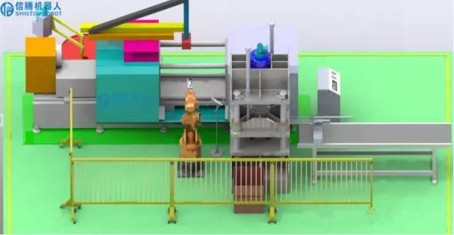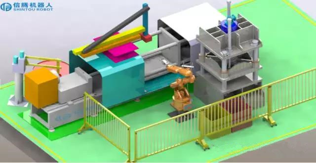 五、機器人取件噴霧一體、檢測、放入切邊機,待切好邊的產品由氣缸下料機械手取出放入輸送線。廢料渣包掉入廢料回爐線。特點:自動化程度高,生產效率高。如下圖