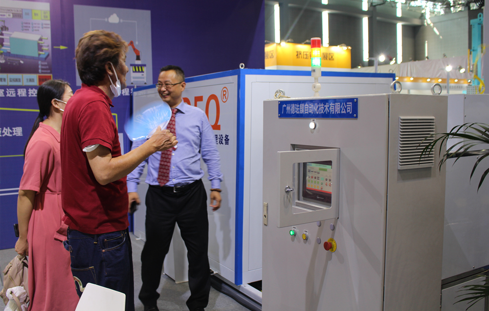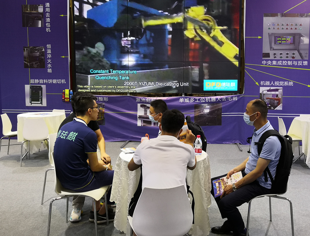 絡繹不絕的專業觀眾前來咨詢和洽談業務 據介紹,德琺麒壓鑄單元廢氣處理設備,具有高效節能、安全穩定等優點。其空氣室內循環,擁有短路保護功能保障設備正常運轉,適應-20℃~+120℃ 環境下整車工作;采用高頻智能電源,相比傳統電源能效節能60%。 蒲昌月先生表示:“該設備外觀結構設計由公司獨立設計,參考國內外企業的優點,維護簡單方便,罩殼采用一塊一塊鋁板拼湊,可獨立分拆,這樣的好處就是有一塊板壞了,只換壞的這塊,不用整體更換,節省了成本。同時,因內部結構沒有死角,在廢氣及少量廢液進入吸入煙塵罩里面,不會有清理困難,而且外部沒有拉管,也減少了安全隱患。整機設計更加科學合理。” 值得一提的是,廣州德琺麒開發的180T轉子高效無人綠色環保機器人智能壓鑄島,還榮獲“2020中國國際鑄造博覽會:全國鑄造裝備創新獎”。據了解,德琺麒于2019年開發了180T轉子環保智能壓鑄島,目前已有3套生產單元交付使用。該壓鑄島,在原先包括機器人取件、機器人噴霧、制品檢測、去渣包、制品冷卻、去除料柄、制品精沖、制品上鑲件、板鏈輸送等設備的基礎上,增加了壓鑄智能煙霧除塵系統、脫模劑現場處理設備,產品自動定位碼垛,以及AGV自動小車輸送系統。整條生產線實現了無人化、環保無污染。