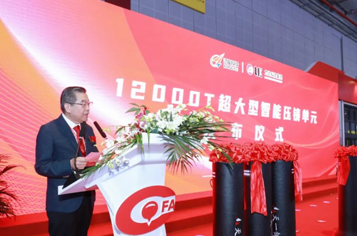 在展會開幕式后,力勁集團、廣東鴻圖科技股份有限公司(以下簡稱“鴻圖科技”)聯合舉行了12000T超大型智能壓鑄單元發布儀式。今年1月22日雙方簽訂該設備的購買協議,經過彼此近9月的不懈努力于近日完成生產總裝,迄今為止全球最大噸位的超級壓鑄機正式面世。