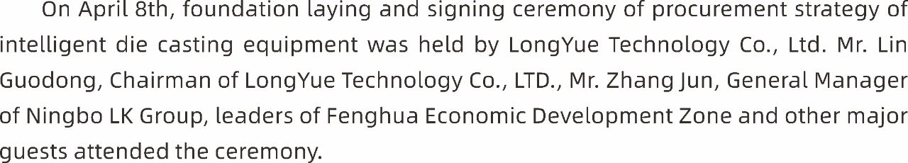 ![]() 4月8日,寧波隆躍科技有限公司(以下簡稱“隆躍科技”)在寧波奉化隆重舉行奠基儀式暨智能壓鑄設備采購戰略簽約儀式!隆躍科技董事長林國棟先生、力勁集團寧波力勁總經理張均先生、奉化區經濟開發區領導等主要嘉賓代表出席儀式。