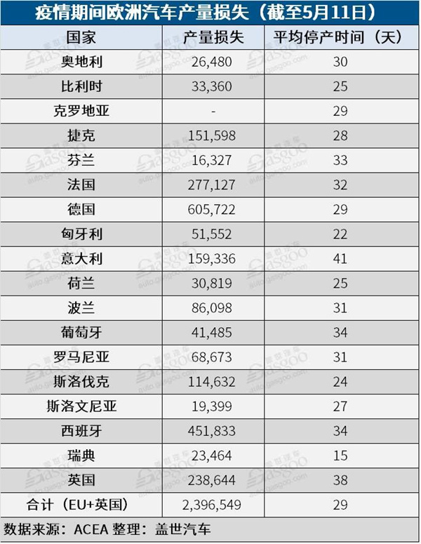根據歐洲汽車工業協會(ACEA)整理的數據,從3月中旬至5月11日,歐盟范圍內因疫情關閉工廠造成的產量損失已達2396549輛。