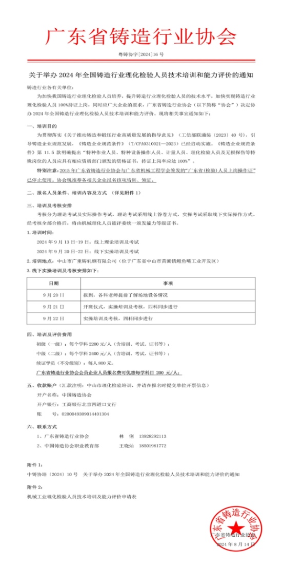 關(guān)于舉辦2024年全國鑄造行業(yè)理化檢驗人員技術(shù)培訓(xùn)和能力評價的通知