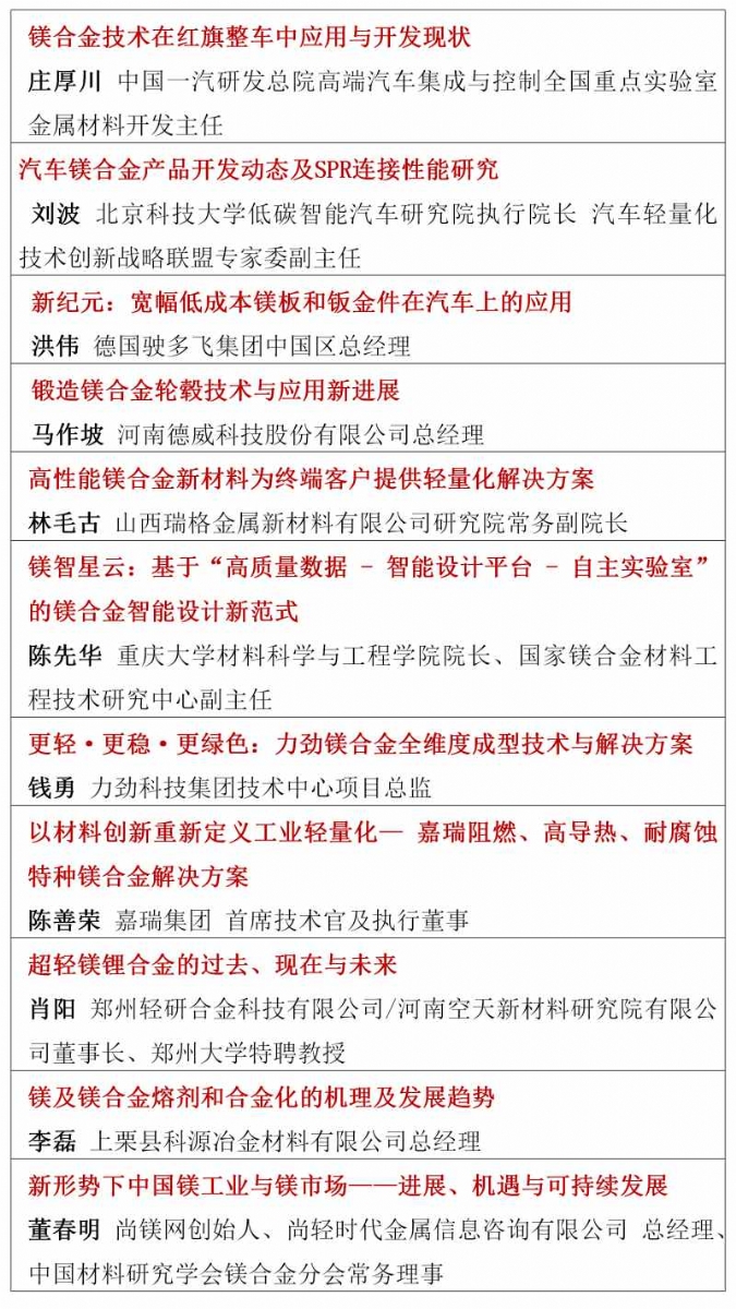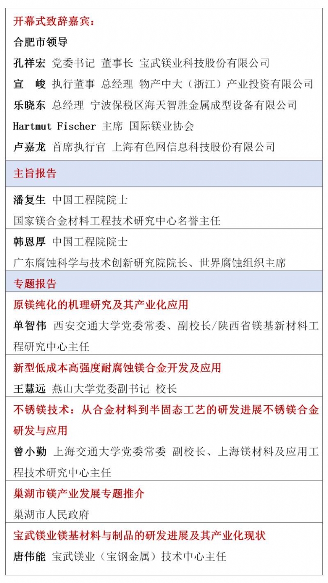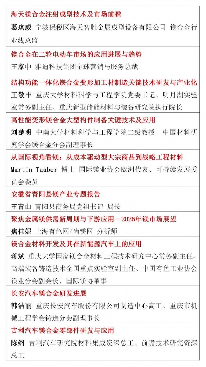 ![]() 2026年的鎂行業,正站在供需改善、需求爆發、政策加持的關鍵拐點,一場屬于鎂合金的春天正在到來。春光不等人,商機不重來。當下正是布局鎂產業鏈、鎖定訂單、拓展渠道、升級技術的黃金窗口期。值此時刻,"2026鎂產業鏈與鎂市場論壇"將于3月30日-4月1日在合肥市盛大啟幕。論壇由國家鎂合金材料工程技術研究中心、中國材料研究學會鎂合金分會特別支持,尚鎂網、上海有色網聯合主辦,寶武鎂業科技股份有限公司、巢湖市人民政府、安徽巢湖經開區管委會、寧波保稅區海天智勝金屬成型設備有限公司、物產中大(浙江)產業投資有限公司等單位協辦,得到了鎂產業鏈眾多骨干企業的支持和參與。這將是本論壇連續第四年舉行。 本次論壇的主題是:合鑄鎂好生態,共塑鎂好未來。論壇的目的是及時交流鎂行業與市場信息,研討鎂制造和應用的前沿科技,為鎂產業鏈企業商業合作、投資合作提供機會,同時,鎂產業鏈各方將借此機會集中展現創新成果,在關鍵時刻在關鍵議題上為鎂行業發聲,營造鎂產業良好發展的氛圍,共商共議構建新型鎂產業生態鏈,助推鎂材料的規模化應用。 本屆論壇亮點紛呈:匯聚強大的論壇合作單位,凝聚行業最硬核力量,30家產業鏈企業及機構鼎力合作搭建鎂交流平臺。特邀32位有影響力和權威性的專家、企業高管發表致辭和演講,高密度分享鎂研發前沿科技、產業化成果及經驗。廣泛邀請全產業鏈相關方深度參與,搭建高效交流平臺,目前已有國內領先的鎂及鎂合金企業、零部件制造企業、30余家整車企業、頭部兩輪電動車企業、知名3C領域制造商和品牌商、鎂產業相關裝備、表面處理企業、研發機構、投融資機構確認與會。今年首設鎂合金材料和汽車鎂合金平行論壇,更深入交流當前鎂市場熱點。將有55家鎂產業鏈骨干企業集中展示,展現他們的鎂合金技術、產品與相關服務。主辦方希望借此盛會,助大家見到更大的舞臺,望見更高的山峰,直面問題、打開格局、拓寬視野、攜手共進。 不負春光,實干興邦;聚力鎂業,共贏未來。讓我們以春為序,乘勢而上,把鎂生意做得更穩、更實、更火,共同開創中國鎂產業高質量發展新篇章! 您的參與也將是論壇成功舉辦的重要方面,期待與您在春暖花開之際,共赴一場“皖鎂之約”! 鎂業盛典 產業風標 2026鎂產業鏈與鎂市場論壇 2026年3月30日—4月1日 安徽·合肥施柏閣酒店