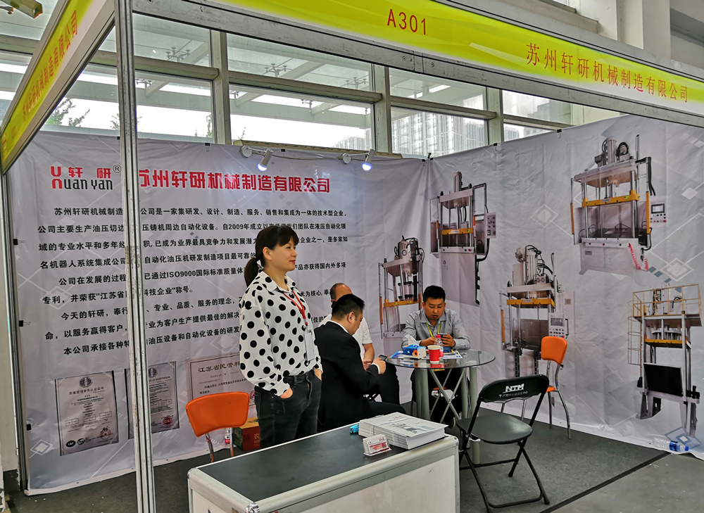 廣州德琺麒參展團隊 另外,廣州德琺麒還推介了其技術領先的DFQ-2500-S 雙聯智能壓鑄島。DFQ-2500-S系廣州德琺麒為廣東鴻特科技股份有限公司開發的雙聯智能壓鑄島,為一套由2臺大型壓鑄機+7套機器人為核心設備組成的智能自動化壓鑄單元。由兩臺2500噸宇部冷室壓鑄機、7臺發那科機器人,配搭定量給湯、鑄件取出、仿形噴霧、去渣包、刻標、鋸料柄、精沖、打毛刺等輔助設備,開發并運用中央集成、實時監控、遠程監控等軟件系統,組成一個雙壓鑄主機的柔性壓鑄島,完成壓鑄生產全工序過程智能自動化。 蘇州軒研:精銳系列切邊機滿足客戶多樣化需求 作為國內專業切邊機制造商,蘇州軒研機械制造有限公司(“蘇州軒研”)自創立以來,一直立足于在切邊機這一細分領域辛勤耕耘,潛心技術研發、質量管理和客戶服務,以高品質切邊機產品、優質的服務樹立良好口碑,獲得眾多知名壓鑄廠商信賴,贏得切邊機領域的一席之地。