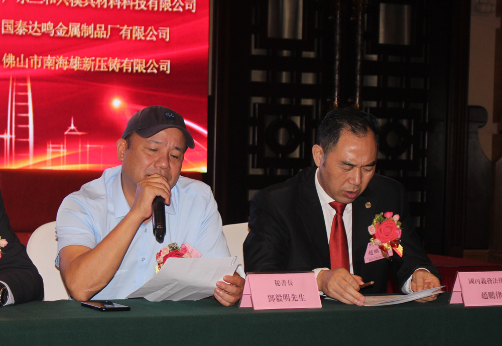 為會(huì)員企業(yè)頒發(fā)會(huì)員盾牌 會(huì)上,蔡子芳會(huì)長為東莞市巨高機(jī)床有限公司、廣東威鋁鋁業(yè)股份有限公司、深圳市華亞數(shù)控機(jī)床有限公司、佛山鎂利好自行車配件有限公司、深圳市富榮精密壓鑄有限公司、佛山市啟新模具有限公司、佛山市泓晉達(dá)壓鑄新材料有限公司、佛山市順德區(qū)甲堅(jiān)金屬制品有限公司、中山市泰益金屬制品廠等9家會(huì)員企業(yè)代表一一頒發(fā)會(huì)員盾牌,并合影留念。