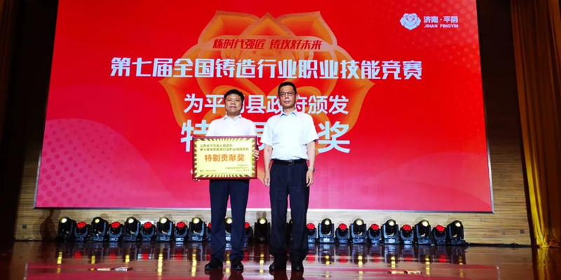 同時,競賽主辦單位為大賽做出突出貢獻的玫德集團有限公司、濟南二機床鑄造有限公司、濟南匯發科技有限公司、平陰縣胡莊制修廠、濟南平陰天宮鑄造有限公司、濟南市平陰縣瑪鋼廠、濟南弘正科技有限公司、濟南格藍壓縮機有限公司、山東力嘉輕量化科技有限公司、山東深泉技師學院等9家企業及理論考場單位頒發“突出貢獻獎”。