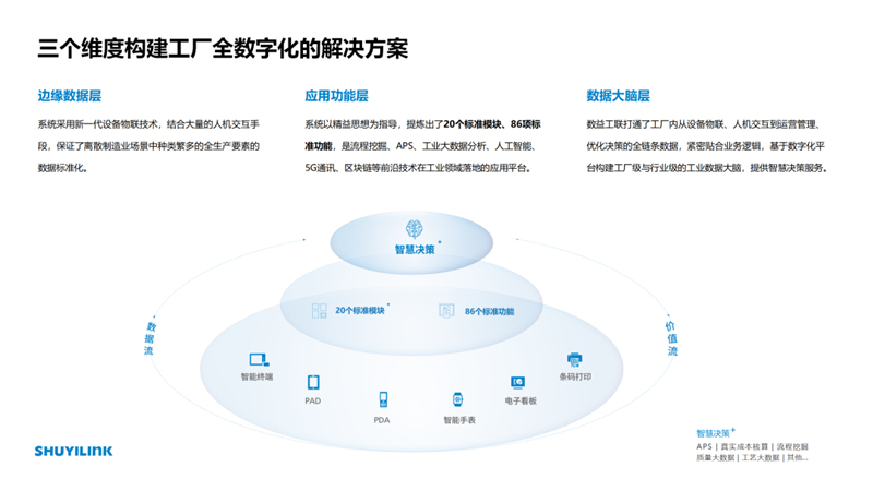 (3)制造企業(yè)對(duì)數(shù)字化的需求強(qiáng)烈,尤其是相對(duì)大型的企業(yè),本身要進(jìn)行大規(guī)模數(shù)字化改造,和整個(gè)自動(dòng)化結(jié)合,和產(chǎn)品的升級(jí)換代結(jié)合。高質(zhì)量的中小制造企業(yè)也亟待享受數(shù)字化所帶來(lái)的紅利,來(lái)加速整個(gè)生產(chǎn)效率的提高。這將是中國(guó)制造彎道超車的機(jī)會(huì)。 (4)新發(fā)展格局下,壓鑄行業(yè)迎來(lái)了結(jié)構(gòu)優(yōu)化的加速調(diào)整期,作為”高溫、高粉塵、高體力強(qiáng)度”的企業(yè),壓鑄企業(yè)的內(nèi)部管理能力、成本控制能力,外部市場(chǎng)抵御風(fēng)險(xiǎn)能力仍有提升空間。數(shù)字化能有效助力壓鑄企業(yè)打通全生產(chǎn)要素?cái)?shù)據(jù)流、提高設(shè)備開(kāi)機(jī)率使用率,實(shí)現(xiàn)產(chǎn)品全追溯。 03.技術(shù)革新特點(diǎn) (1)數(shù)益工聯(lián)擁有極強(qiáng)的數(shù)據(jù)采集能力,能夠采用新一代設(shè)備物聯(lián)技術(shù),結(jié)合大量的人機(jī)交互手段,將離散制造業(yè)場(chǎng)景中的 “人、機(jī)、料、法、環(huán)、測(cè)、能源”等種類繁多的全生產(chǎn)要素?cái)?shù)據(jù)標(biāo)準(zhǔn)化。 (2)以精益思想為指導(dǎo),提煉出20個(gè)標(biāo)準(zhǔn)模塊、86項(xiàng)標(biāo)準(zhǔn)功能,應(yīng)用不同模塊內(nèi)容切實(shí)解決痛點(diǎn),實(shí)現(xiàn)企業(yè)橫向業(yè)務(wù)全流程打通,縱向數(shù)字化管理全人員打通。(3)擁有工業(yè)數(shù)據(jù)產(chǎn)品研發(fā)能力,緊密貼合業(yè)務(wù)邏輯,基于數(shù)字化平臺(tái)構(gòu)建工廠級(jí)與行業(yè)級(jí)的工業(yè)數(shù)據(jù)大腦,實(shí)現(xiàn)工廠APS自動(dòng)排產(chǎn)、工業(yè)大數(shù)據(jù)分析,設(shè)備的預(yù)測(cè)性維修、智能的異常感知等多種智能化的功能提供智慧決策服務(wù),將數(shù)據(jù)價(jià)值從系統(tǒng)里提升出來(lái)。 04.創(chuàng)新產(chǎn)品優(yōu)勢(shì) (1)“IE+IT”雙輪驅(qū)動(dòng)打造全5G壓鑄數(shù)字工廠 顛覆國(guó)際主流的改造設(shè)備、改造生產(chǎn)“大改大造”模式,不同于國(guó)內(nèi)純軟件定制路線,數(shù)益采用“IE(工業(yè)工程)+IT(信息技術(shù))”模式,將精益工程理念融入軟件系統(tǒng),實(shí)現(xiàn)了從現(xiàn)場(chǎng)到業(yè)務(wù)的縱向集成。核心團(tuán)隊(duì)為清華背景,有深厚的制造業(yè)精益運(yùn)營(yíng)管理能力和豐富的壓鑄行業(yè)數(shù)字化工廠實(shí)施經(jīng)驗(yàn),旨在服務(wù)離散制造業(yè)客戶通過(guò)數(shù)字化顯著改善質(zhì)量管理水平、提升企業(yè)生產(chǎn)效率、降低制造成本。 (2)實(shí)現(xiàn)壓鑄工廠超90%數(shù)字化管理需求標(biāo)準(zhǔn)化 數(shù)益工聯(lián)按照工業(yè)工程和精益管理的底層理念,考慮了眾多細(xì)分行業(yè)和客戶場(chǎng)景,構(gòu)建了20個(gè)產(chǎn)品模塊、86個(gè)標(biāo)準(zhǔn)功能,69個(gè)核心亮點(diǎn)。針對(duì)大型制造企業(yè),實(shí)現(xiàn)了工廠85%數(shù)字化管理需求的標(biāo)準(zhǔn)化和可配置化,15% 的個(gè)性化服務(wù)。具體到壓鑄行業(yè),已達(dá)到高度的適配性,定制化服務(wù)比例僅需5%~10%,可為企業(yè)提供可靠完善的壓鑄數(shù)字化工廠解決方案。 (3)“131”快速交付與投資回報(bào) 1周規(guī)劃,數(shù)字化工廠項(xiàng)目顧問(wèn)與設(shè)備物聯(lián)工程師通過(guò)現(xiàn)場(chǎng)調(diào)研工廠的設(shè)備、產(chǎn)品制造、運(yùn)營(yíng)管理及倉(cāng)儲(chǔ)物流等實(shí)際情況,制訂有效的數(shù)字化工廠規(guī)劃落地方案。 3個(gè)月上線,根據(jù)規(guī)劃的模塊與功能,設(shè)計(jì)標(biāo)準(zhǔn)化的項(xiàng)目實(shí)施路徑,構(gòu)建兩條主線(數(shù)字工廠實(shí)施藍(lán)圖、物聯(lián)采集)和三條支線(網(wǎng)絡(luò)、服務(wù)器、人機(jī)交互設(shè)備),最終實(shí)現(xiàn)設(shè)備的物聯(lián)采集和生產(chǎn)管理的全面數(shù)字化。 1年投資回收,基于數(shù)據(jù)應(yīng)用與價(jià)值分析,持續(xù)跟蹤運(yùn)營(yíng)指標(biāo)的改善,提升生產(chǎn)效率、改善產(chǎn)品質(zhì)量、優(yōu)化庫(kù)存交期,通過(guò)提質(zhì)、增效、降本實(shí)現(xiàn)數(shù)字化工廠投入的快速回收。 05.創(chuàng)新技術(shù)專利情況 本產(chǎn)品屬于國(guó)家支持的一、電子信息(一)軟件11.云計(jì)算與移動(dòng)互聯(lián)網(wǎng)軟件高新技術(shù)領(lǐng)域。2021年12月,數(shù)益工聯(lián)制造執(zhí)行系統(tǒng)V1.0.0獲得浙江省首臺(tái)(套)產(chǎn)品,省內(nèi)首版次軟件認(rèn)定。軟件及相關(guān)技術(shù)均屬企業(yè)自主研發(fā),擁有技術(shù)全部所有權(quán),目前已授權(quán)計(jì)算機(jī)軟件著作權(quán)18項(xiàng),已授權(quán)外觀專利7項(xiàng),正在申請(qǐng)中發(fā)明專利5項(xiàng)。作為起草單位參與的1項(xiàng)國(guó)家標(biāo)準(zhǔn)處于審批階段,工業(yè)互聯(lián)網(wǎng)平臺(tái)-應(yīng)用實(shí)施指南(20211170-T-339)。