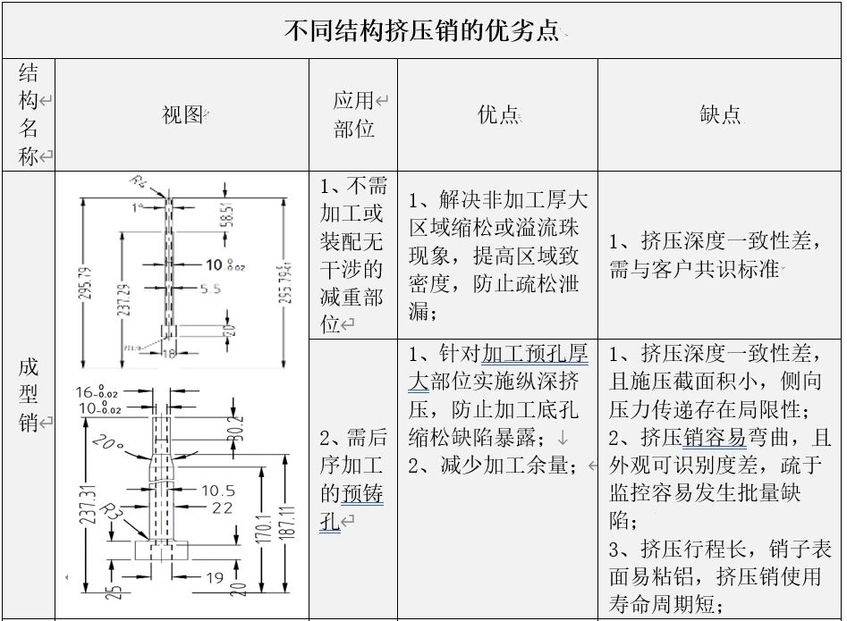 ![]() 原標(biāo)題:擠壓銷設(shè)計(jì)與應(yīng)用 摘要:基于擠壓銷在使用過程中受結(jié)構(gòu)設(shè)計(jì),配合精度以及應(yīng)用部位溫度變化影響,導(dǎo)致故障率高,使用壽命短,以此增加壓鑄件生產(chǎn)過程問題的處理與管控難度;文章就如何正確選擇合適的擠壓銷,匹配合理參數(shù),控制“溫度場(chǎng)”,從而提高擠壓銷運(yùn)行的穩(wěn)定性,使產(chǎn)品被擠壓部位質(zhì)量缺陷得以解決。 前言:縮孔是鋁合金壓鑄件的致命質(zhì)量缺陷及報(bào)廢原因之一,其形成的機(jī)理是合金液凝固時(shí)的收縮特性所致。產(chǎn)品壁厚不均,薄壁處優(yōu)先凝固,阻礙合金液流動(dòng)和壓力傳遞,局部厚大熱節(jié)部位無法補(bǔ)縮而形成縮孔。而局部加壓補(bǔ)縮(以下簡(jiǎn)稱:擠壓銷)是有效解決縮孔缺陷的主要工藝措施。 由于被擠壓區(qū)域鋁液和模具溫度變化,擠壓銷結(jié)構(gòu)設(shè)計(jì)與裝配尺寸的影響,使其在實(shí)際應(yīng)用中壽命短,易卡滯或卡死,擠壓效果不佳,被擠壓區(qū)域存在分層現(xiàn)象,且工藝量化固化困難,導(dǎo)致生產(chǎn)連續(xù)性差,產(chǎn)品質(zhì)量不穩(wěn)定。本文就如何用好擠壓工藝,在擠壓銷的結(jié)構(gòu)設(shè)計(jì)和應(yīng)用上作簡(jiǎn)要解析。 01擠壓銷結(jié)構(gòu)分類與優(yōu)劣點(diǎn)概述 擠壓結(jié)構(gòu):擠壓銷常用結(jié)構(gòu)可分為“成型銷,盲銷,出型避空銷”。通常基于產(chǎn)品缺陷部位形狀,所處位置與后工序處理要求而選擇不同結(jié)構(gòu)的擠壓銷,在“表1”列表中針對(duì)三種不同形態(tài)的擠壓銷的優(yōu)、劣點(diǎn)作了橫向比較。