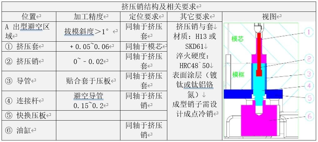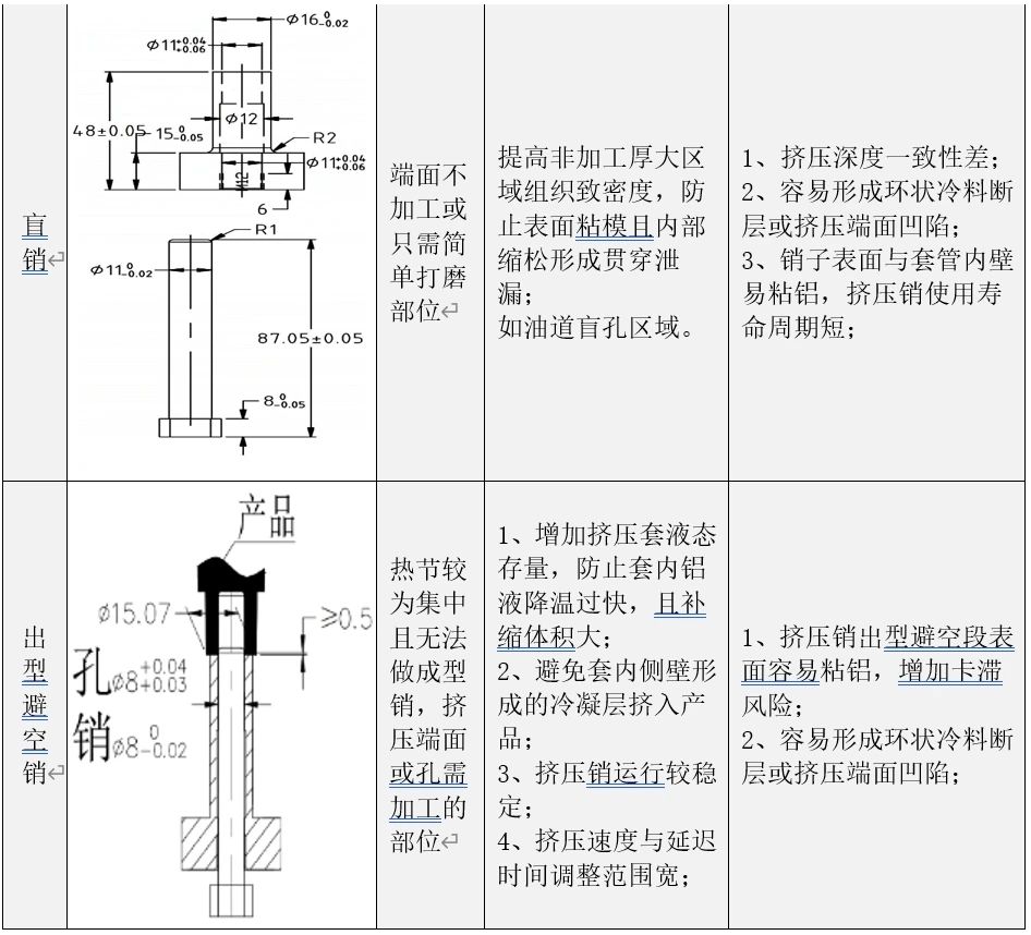 表3 擠壓銷結(jié)構(gòu)及相關(guān)要求 03擠壓銷的幾個(gè)關(guān)鍵參數(shù) 1)擠壓延時(shí):擠壓延時(shí)通常指型腔充填完成或者增壓?jiǎn)?dòng)開始,至擠壓銷啟動(dòng)這段時(shí)間。延時(shí)過短,整個(gè)型腔金屬處于全液態(tài)狀態(tài),金屬液尚未達(dá)到固-液相轉(zhuǎn)變溫度,在此階段型腔內(nèi)金屬液流動(dòng)性好,可通過澆道在鑄造壓力作用下得到整體補(bǔ)縮,但不能達(dá)到厚大區(qū)域局部補(bǔ)縮的目的;延時(shí)過長,用于擠壓補(bǔ)縮的金屬液或需補(bǔ)縮部位的液體已凝固,喪失流動(dòng)性,從而失去補(bǔ)縮的功能;正確的延時(shí)是需補(bǔ)縮的區(qū)域已成為孤立的固-液相區(qū),其周邊通道已經(jīng)固化,擠壓補(bǔ)縮于厚大部位的最后凝固區(qū)。 2)持壓時(shí)間:是指擠壓銷開始施壓到施壓結(jié)束這段時(shí)間。該段時(shí)間的長短以被擠壓區(qū)域金屬液固化,擠壓區(qū)域不產(chǎn)生溢流珠為最短合適的時(shí)間,多則無益。該時(shí)間段的長短受被擠壓熱節(jié)區(qū)域體積大小,模具溫度,鋁液溫度變化影響。
