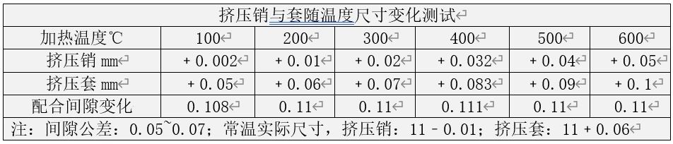 表2 擠壓銷與套隨溫度尺寸變化測(cè)試