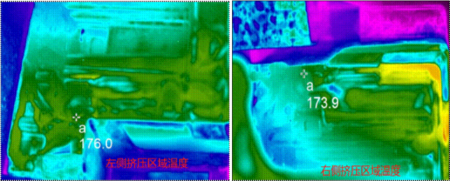 圖3 高壓油道擠壓區(qū)域溫度 經(jīng)排查發(fā)現(xiàn),下滑塊循環(huán)冷卻水處于關(guān)閉狀態(tài),導(dǎo)致右側(cè)擠壓區(qū)域質(zhì)量波動(dòng)。“圖4”中測(cè)溫復(fù)查結(jié)果顯示,開啟冷卻水后,右側(cè)降溫至173.9℃,左側(cè)降溫至176.0℃;X射線探傷確認(rèn),右側(cè)高壓油道擠壓區(qū)域無縮松。注:調(diào)整期間需測(cè)量擠壓深度變化,并以X射線探傷確認(rèn)質(zhì)量。