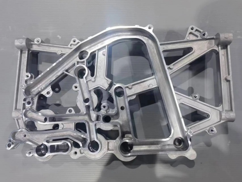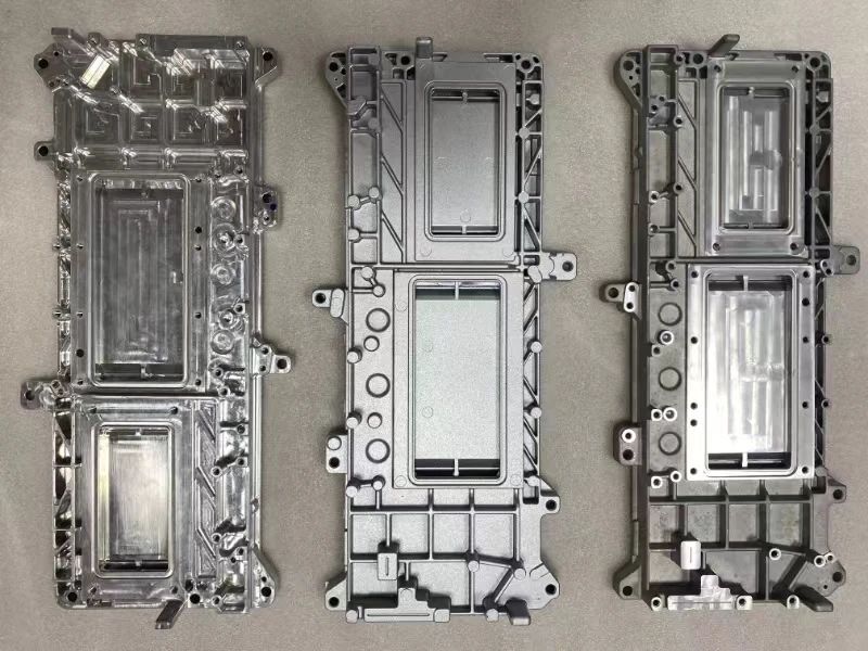 新能源電動汽車電控箱殼體整套成功的壓鑄模具開發是集材料、熱處理、模具設計、壓鑄工藝、加工、裝配工藝、管理、品控等多項技術系統整合及運用,是一個龐大的系統工程。其中壓鑄工藝方案設計是非常重要的一環,工藝的合理性直接影響鑄件的質量和后續生產加工環節。電控箱殼體結構復雜,內部質量要求高。如螺紋加工不允許有爛牙、氣孔率要求≤2%等。對此類復雜型壓鑄件,良好的壓鑄工藝設計方案對產品的質量起著決定性作用。 針對難點公司采取澆排系統設計與抽真空方案,壓鑄模具在高溫高壓環境下工作,對模具材料和抗熱疲勞性能要求高,而且結構復雜、壁厚相差大,并要求通過高壓下的滲漏試驗,因此鑄造中產生的能夠導致泄漏的氣縮孔、粘模等缺陷是首先需要規避的。選擇符合壓鑄工藝要求澆排系統,特別是內澆口位置和導向,應使金屬液流動平穩順暢,并有序的排除型腔內氣體,以達到良好的填充效果和避免壓鑄缺陷產生的目的。通過對產品的結構及性能要求分析,進行澆排設計。首先采用鑄造仿真軟件對產品的澆注和排溢系統進行充填、粒子追蹤、氣壓、溫度、凝固等過程的數值模擬分析,其次根據分析結果來確認方案設計的合理性,最終通過生產試驗進行工藝設計方案的合理性驗證。 鑒賞鑄件二 鑄件名稱:水冷板