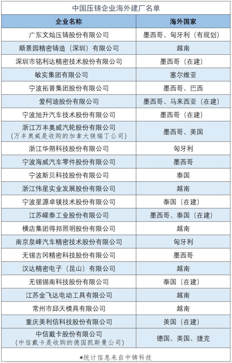 ![]() 近年來,隨著壓鑄企業(yè)“國際化”步伐的加快,許多國內(nèi)企業(yè)紛紛在歐洲、美洲、東南亞等全球投資設(shè)廠,這一趨勢已經(jīng)成為行業(yè)內(nèi)的熱門話題。為了給業(yè)界提供參考,特此整理了在海外建廠的中國壓鑄企業(yè)名單。