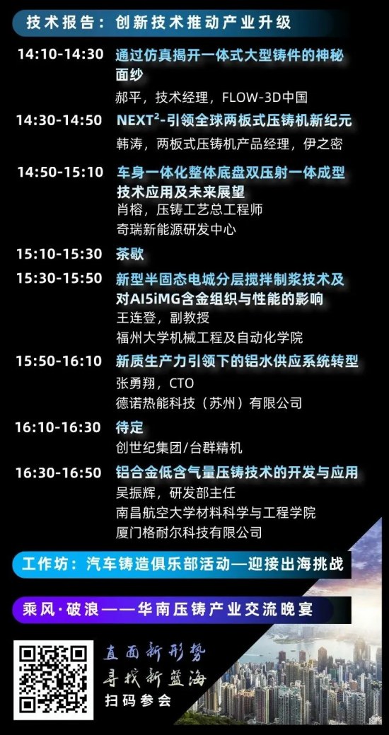 奇瑞汽車(CHERY)全球首臺全尺寸整體車身一體化壓鑄件及宜安科技鎂合金鑄件齊亮相"2024華南壓鑄產業會議" 4 鎂合金論壇 鎂合金論壇+圓桌探討(鎂合金技術與市場發展):鎂合金壓鑄名企宜安科技(上交所上市企業)、嘉瑞集團(港交所上市企業),力勁集團(港交所上市企業),尚鎂網(鎂合金專家董春明)派專家做鎂合金相關主題報告,并就“鎂合金技術及市場”展開圓桌探討。 5 前沿技術 大會聚焦先進壓鑄關鍵技術和應用等主題,邀請眾多知名企業和機構將參與演講,包括上汽通用、廣汽、東風汽車、奇瑞汽車、嘉瑞集團、宜安科技、中國汽車電子產業聯盟(汽車行業資深專家馬建軍)、海天智勝金屬、伊之密、南昌航空大學、福州大學、阿瑞斯工業爐、蘇州德諾、FLOW-3D中國、創世紀集團等,將參與本次會議并做演講。 6 對話行業領袖-圓桌訪談 主持人來自上汽通用,對話嘉賓來自文燦集團、大連亞明、創世紀集團、力勁集團等,主題“新能源與未來壓鑄” 7 對話AI,賦能壓鑄 同期“AI重塑壓鑄--西門子Xcelerator生態解決方案研討會”,深入探討AI在壓鑄工藝優化中的應用(11月7日下午)