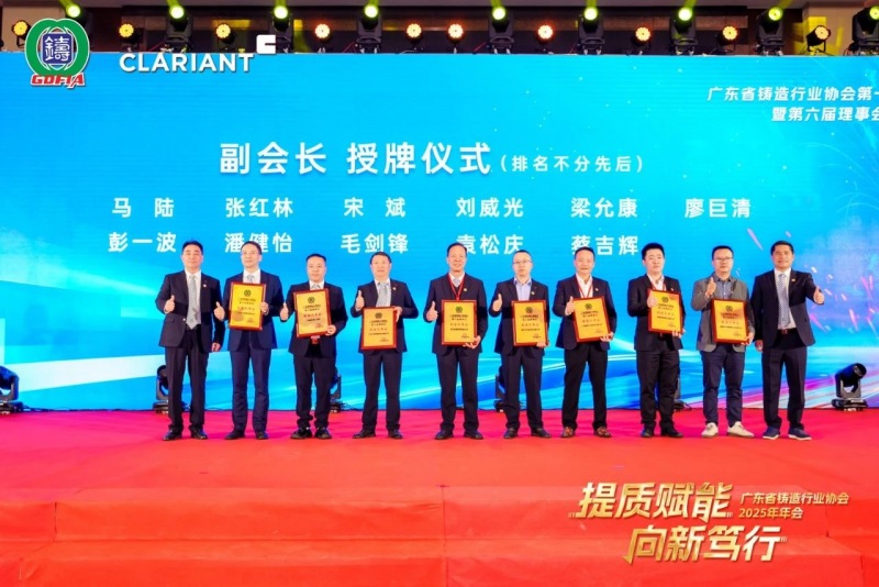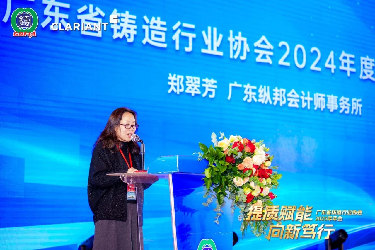 中國機械工業聯合會副會長中國鑄造協會會長張立波先生致辭 會上,廣東縱邦會計師事務所鄭翠芳女士、廣東省鑄造行業協會常務秘書長李慧真女士還分別做了協會2024年度財務報告、2025年工作計劃的匯報。隨后,主辦方進行了新一屆理事會宣誓就職及多項榮譽頒發等環節。