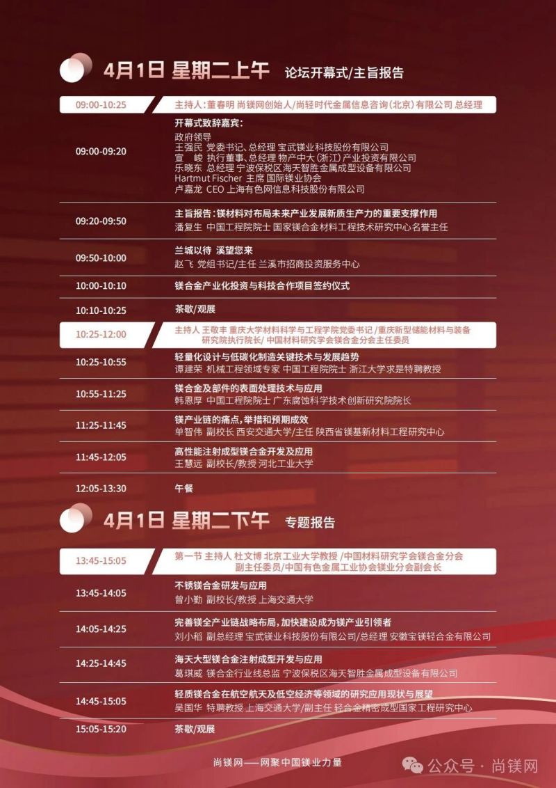 2025鎂產(chǎn)業(yè)鏈論壇三大亮點 2025鎂產(chǎn)業(yè)鏈與鎂市場論壇將于3月31日-4月2日在浙江金華舉行。本次論壇的主題是“鎂-為中國制造減重,為低碳經(jīng)濟賦能”。鎂產(chǎn)業(yè)鏈人士將再度聚首山清水秀之鄉(xiāng),借此契機匯聚更多力量,看見更多精彩,展現(xiàn)更大格局,在關(guān)鍵時期、關(guān)鍵議題上一起為鎂材料發(fā)聲、為鎂產(chǎn)業(yè)助力,共商構(gòu)建鎂產(chǎn)業(yè)鏈生態(tài)圈大計,以市場機制和市場力量推動鎂產(chǎn)業(yè)鏈高質(zhì)量發(fā)展,推動鎂材料的規(guī)模化的應(yīng)用! 本次論壇由尚鎂網(wǎng)、上海有色網(wǎng)聯(lián)合主辦,國家鎂合金材料工程技術(shù)研究中心、中國材料研究學(xué)會鎂合金分會特別支持,重慶大學(xué)長三角(蘭溪)鎂材料研究中心、蘭溪市華創(chuàng)金屬材料研究院有限公司特別協(xié)辦,寶武鎂業(yè)、物產(chǎn)中大產(chǎn)投、物產(chǎn)中大柒鑫合金、海天智勝金屬成型設(shè)備協(xié)辦,并得到了國際鎂學(xué)會、國際鎂業(yè)協(xié)會及多家骨干企業(yè)的支持,聚力搭建鎂產(chǎn)業(yè)鏈交流平臺。 論壇的首要亮點是聚焦鎂產(chǎn)業(yè)熱點議題和前沿科技 論壇期間,將安排23篇專題報告。中國工程院院士、重慶市科協(xié)主席、國家鎂合金材料工程技術(shù)研究中心名譽主任潘復(fù)生將做主旨演講,他將圍繞“鎂材料對布局未來產(chǎn)業(yè)發(fā)展新質(zhì)生產(chǎn)力的重要支撐作用”做高端分享。中國工程院院士、浙江大學(xué)求是特聘教授譚建榮將做題為“輕量化設(shè)計與低碳化制造關(guān)鍵技術(shù)與發(fā)展趨勢”的專題演講;中國工程院院士、廣東腐蝕科學(xué)技術(shù)創(chuàng)新研究院院長韓恩厚將做題為“鎂合金及部件的表面處理技術(shù)與應(yīng)用”的專題演講。寶武鎂業(yè)科技股份有限公司黨委書記、總經(jīng)理王強民、物產(chǎn)中大(浙江)產(chǎn)業(yè)投資有限公司總經(jīng)理宣峻、海天智勝金屬成型設(shè)備有限公司總經(jīng)理樂曉東、上海有色網(wǎng)信息科技股份有限公司首席執(zhí)行官盧嘉龍將在開幕式上發(fā)表致辭,國際鎂業(yè)協(xié)會主席Hartmut Fischer先生也將發(fā)表視頻致辭。 演講嘉賓還有來自國內(nèi)一流鎂合金研發(fā)機構(gòu)和團隊的領(lǐng)軍科學(xué)家,包括重慶大學(xué)、上海交大、西安交大、河北工業(yè)大學(xué)、湖南大學(xué);有來自國內(nèi)外鎂及鎂合金產(chǎn)業(yè)鏈領(lǐng)軍企業(yè)寶武鎂業(yè)、塞力斯汽車、上汽集團、海天智勝金屬成型設(shè)備、雅迪科技集團、通用汽車、質(zhì)子汽車、科源冶金等;有來自鎂產(chǎn)業(yè)相關(guān)協(xié)會和機構(gòu)的負責(zé)人和專家,包括國際鎂協(xié)、青陽縣人民政府、尚鎂網(wǎng)、上海有色網(wǎng)等。專題演講內(nèi)容涉及鎂業(yè)市場與形勢分析、高效鎂冶煉加工技術(shù)、鎂合金開發(fā)與應(yīng)用案例分享、鎂合金材料進展、鎂業(yè)可持續(xù)發(fā)展、鎂業(yè)公司戰(zhàn)略等。演講人均為行業(yè)知名專家和領(lǐng)軍企業(yè)高管,分享的都是鎂及鎂合金前沿科技和最佳產(chǎn)業(yè)實踐,契合當(dāng)前產(chǎn)業(yè)化實際和行業(yè)熱點、焦點議題。 論壇的第二大亮點是設(shè)立展示交流區(qū),集中展示鎂產(chǎn)業(yè)鏈創(chuàng)新成果 論壇期間還將開設(shè)展示區(qū),目前全部展位已經(jīng)訂完。將有40家鎂產(chǎn)業(yè)鏈企業(yè)現(xiàn)場展示其最新開發(fā)的鎂合金產(chǎn)品、先進加工技術(shù)和裝備、原輔材料及相關(guān)服務(wù)。據(jù)悉,這將是全球范圍內(nèi)最多企業(yè)參與的鎂產(chǎn)業(yè)集中商業(yè)展示活動,如您到場,可以一站式接觸到目前最新開發(fā)的鎂產(chǎn)品和相關(guān)技術(shù)供應(yīng)商。今年參展企業(yè)極具代表性,展示產(chǎn)品和服務(wù)涉及原鎂及鎂合金材料、鎂合金壓鑄件、半固態(tài)加工產(chǎn)品、型材及板材和鍛件等變形加工產(chǎn)品、鎂合金壓鑄和半固態(tài)加工設(shè)備、鎂合金表面處理產(chǎn)品和技術(shù)、鎂合金鈑金件和精密加工產(chǎn)品、鎂業(yè)環(huán)保裝備和技術(shù)、鎂粉和鎂粒子加工設(shè)備、鎂溶劑及輔助材料、鎂檢測裝備和服務(wù)等。 目前已經(jīng)確定參展的知名企業(yè)包括:寶武鎂業(yè)、鎂瑞丁輕量化技術(shù)公司、海天智勝金屬成型設(shè)備、鎂陽智能裝備、交叉離子新材料、上海紫燕合金、寧波鑫林模具、山東天鎂新材料、伯樂智能裝備、山西銀光華盛鎂業(yè)、路飛鎂業(yè)、華孚精密科技、浙江連連寶、八達鎂業(yè)、陜西輕特鎂科技、吉同鎂合金科技、北京勵德展覽有限公司、物產(chǎn)中大柒鑫合金材料、舜富精密科技、瑞格金屬新材料、富亨迪新材料、重慶大學(xué)長三角(蘭溪)鎂材料研究中心、馬德寶真空泵設(shè)備、山東保藍環(huán)保、萬邦勝輝新能源科技、Stolfig Group(駛多飛集團)、伊之密、神木利臻科技、山東奧瑯智能科技、徠孚科技、聞喜縣康泰金屬制品、太倉萬信達化工、河南明鎂鎂業(yè)、北京適創(chuàng)科技、濮陽市名利石化機械設(shè)備、寧波得鑫科技有限公司、上栗縣科源冶金材料、貝匯特機械制造科技、湖北鎂器時代新材料有限公司等。 值