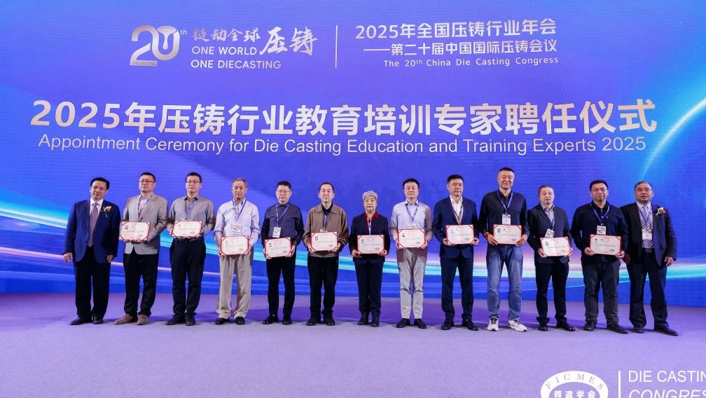 2025年全國壓鑄行業教育培訓專家聘任儀式 為持續推動壓鑄人才隊伍建設,開幕式期間還隆重舉行了“2025年全國壓鑄行業教育培訓專家聘任儀式”,本次共聘任11名專家,由中國機械工程學會鑄造分會副理事長、清華大學熊守美教授,中國機械工程學會鑄造分會副理事長、上海交通大學吳國華教授頒發聘任證書。感謝受聘專家的卓越貢獻,并呼吁更多資深專家投身壓鑄人才培養工作,共同推動中國從鑄造大國邁向鑄造強國,助力行業高質量發展。
