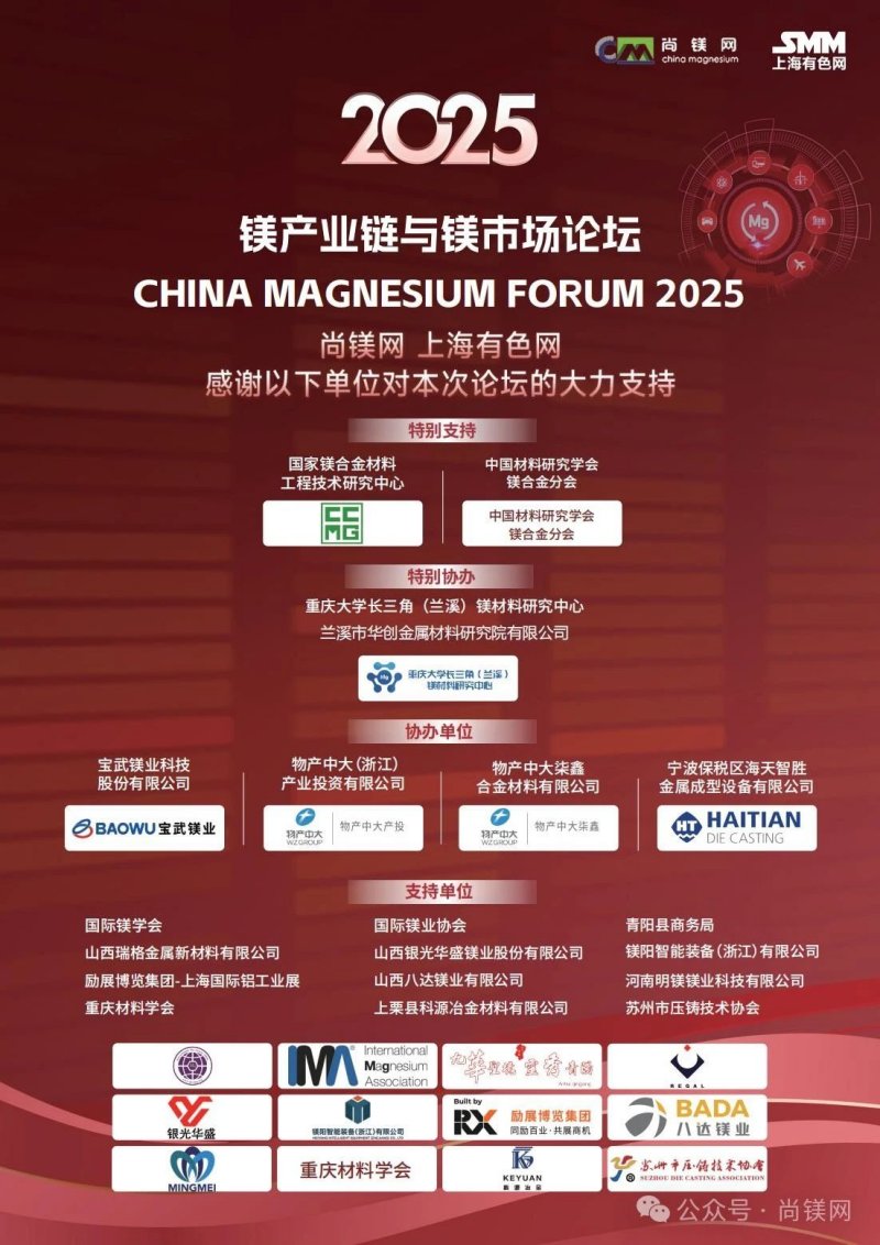 ![]() 2025年3月31日-4月2日,2025鎂產業鏈與鎂市場論壇在浙江省金華市成功召開。本次論壇由尚鎂網、上海有色網聯合主辦。來自政府機構、科研單位、鎂產業鏈企業、金融企業、技術及裝備供應商、貿易公司、新聞媒體等逾千人參會。 會議共商構建鎂產業鏈生態圈大計,以市場機制和市場力量推動鎂產業鏈高質量發展,推動鎂材料的規模化應用。中國工程院院士、國家鎂合金材料工程技術研究中心名譽主任潘復生,中國工程院院士譚建榮,中國工程院院士韓恩厚,寶武鎂業科技股份有限公司總經理王強民,陜西省榆林市人大常委會主任王國忠,西安交通大學副校長、陜西省鎂基新材料工程研究中心主任單智偉,上海交通大學副校長曾小勤,河北工業大學副校長王慧遠等嘉賓出席會議。 王強民、寧波保稅區海天智勝金屬成型設備有限公司總經理樂曉東、上海有色網首席執行官盧嘉龍分別為大會致辭,國際鎂業協會主席哈特穆特·菲舍爾以視頻形式致辭,潘復生作題為《鎂材料對布局未來產業發展新質生產力的重要支撐作用》的主旨報告,蘭溪市招商投資服務中心黨組書記趙飛作蘭溪市推介報告。開幕式上,還舉行了鎂合金產業化投資與科技合作項目簽約儀式。尚輕時代金屬信息咨詢(北京)有限公司總經理、尚鎂網創始人董春明主持開幕式。