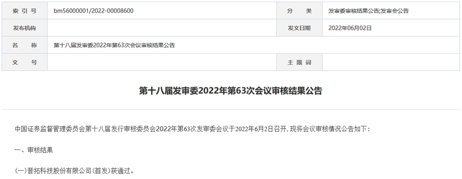 ![]() 《壓鑄周刊》訊 2022年6月2日,行業(yè)知名鋁合金精密壓鑄件廠商——晉拓科技股份有限公司(“晉拓科技”)首次公開募股申請獲證監(jiān)會發(fā)審委會議審核通過(即“IPO成功過會”),擬在上海證券交易所主板上市。