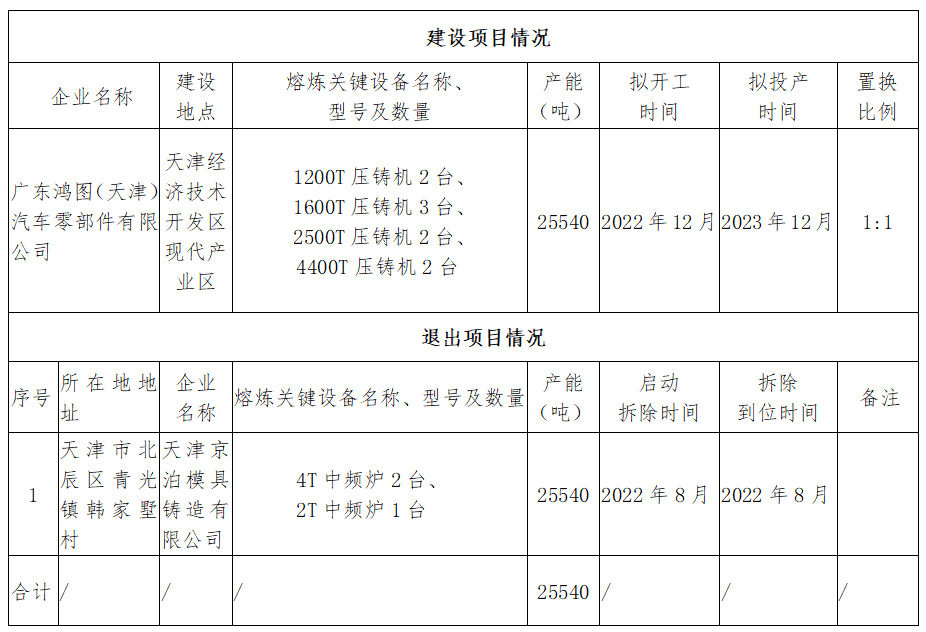 ![]() 原標(biāo)題:廣東鴻圖天津基地?cái)M置換25540噸鑄造產(chǎn)能,配置1200-4400T壓鑄設(shè)備 近日(10月8日),天津市工業(yè)和信息化局在其官網(wǎng)公示了廣東鴻圖(天津)汽車零部件有限公司(下稱“天津鴻圖”)建設(shè)項(xiàng)目鑄造產(chǎn)能置換方案。據(jù)悉,天津鴻圖系廣東鴻圖科技股份有限公司(下稱“廣東鴻圖”)全資子公司,注冊資本2500萬元。 公告顯示,此次天津鴻圖擬置換天津京泊模具鑄造有限公司的25540噸鑄造產(chǎn)能。項(xiàng)目建設(shè)地位于天津經(jīng)濟(jì)技術(shù)開發(fā)區(qū)現(xiàn)代產(chǎn)業(yè)區(qū),將新增壓鑄機(jī)1200T 2臺、1600T 3臺、2500T 2臺、4400T 2臺。項(xiàng)目擬于2022年12月開工建設(shè),2023年12月投產(chǎn)。