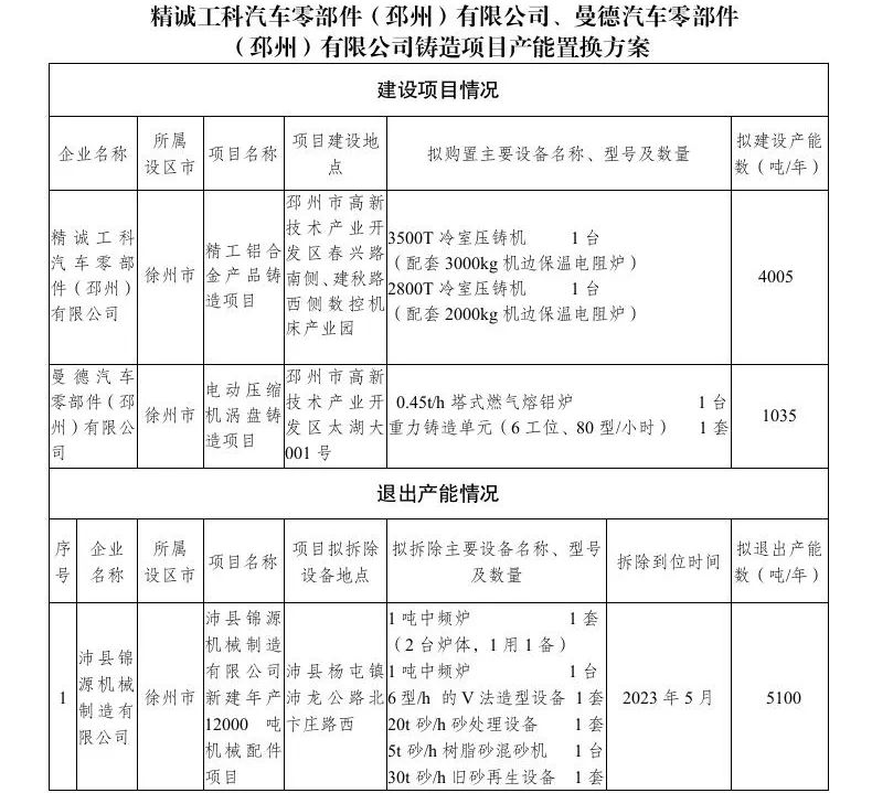 ![]() 昨日(3月27日),蘇省工業(yè)和信息化廳發(fā)布信息,對精誠工科汽江車零部件(邳州)有限公司、曼德汽車零部件(邳州)有限公司等2家企業(yè)鑄造項(xiàng)目產(chǎn)能置換方案進(jìn)行公示。上述2家企業(yè)擬所需年鑄造產(chǎn)能合計(jì)為5040噸。