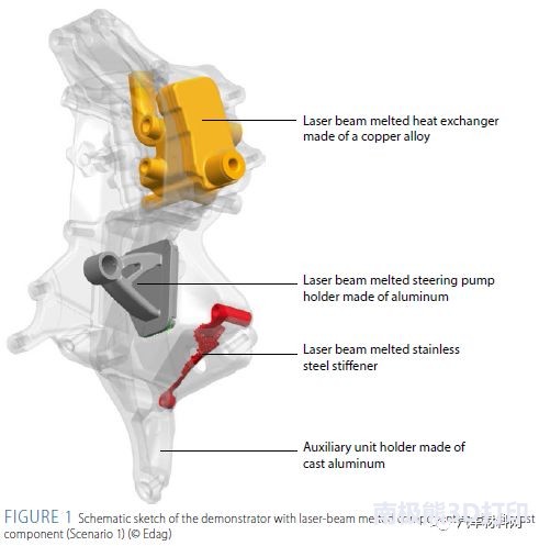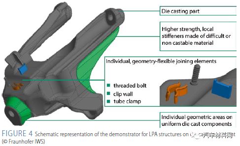 2在壓鑄結構中添加附加件 方案2研究了在鑄造部件上通過激光金屬粉末沉積技術(LDP)和焊接工藝實現附加部件的技術方案。與方案1不同,方案2是以壓鑄件為基礎(如圖4中灰色部分),采用LPD技術制造附加結構,并通過焊接實現結合。