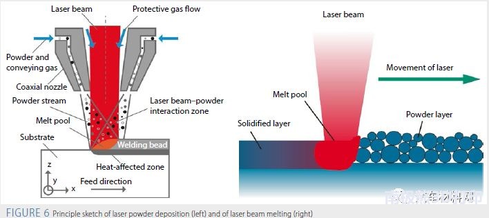 激光粉末沉積(LDP)是通過借助于聚焦激光束局部熔化基板表面將金屬或陶瓷填充材料以粉末形式焊接到金屬基板上的過程。如圖6(左)所示,填充材料首先通過吸收激光束能量熔化,然后再從熔池吸收熱量后完全熔化。該過程需在保護性氣體氣氛下進行,以避免發生不需要的化學反應。熔體通過散熱進入部件而固化,形成焊珠。多個焊珠的堆疊形成整個三維結構。適合的材料有鋼、鎳、鈷、鋁、銅、鈦等。 在激光束熔化中,如圖6(右)所示,組件是由粉末分層堆疊而成的。將組件的CAD文件分層導入系統后,在限定高度將粉末層施加在基板上,激光束在惰性氣體氣氛中掃描粉末床表面,在對應的點熔化,進而固化。然后再施加下一層,直至整個部件完成,最后將部件移出。