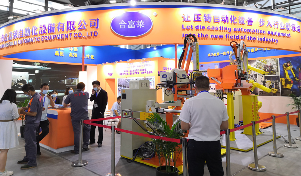 東莞合富萊參展團隊,左6為公司技術總監楊炳榮先生 2020年7月15日-17日,“2020國際壓鑄展”在上海新國際博覽中心隆重舉行。行業知名壓鑄自動化設備及解決方案提供商--東莞市合富萊自動化設備有限公司(下稱“東莞合富萊”)落座N2館N2A31展位,現場展示各式各樣的壓鑄自動化設備,為壓鑄廠用戶提供全方位壓鑄自動化解決方案。 據了解,東莞合富萊此次展示多款伺服高速節能壓鑄給湯、噴霧、取件機械手產品,機器人集成壓鑄島解決方案及成功案例,以及首次在國際壓鑄展亮相新產品-- HFLREB系列連桿噴取機器人。其中,伺服高速節能壓鑄機械手,有五連桿式高速給湯機(HFLLD-2#)、連桿式單伺服沃鈴噴霧機(HFLRADMW-2#)、連桿式伺服取出機(HFLEADM-2#)、熱室伺服噴取一體機(HFLREDMW-2#);噴霧、取件機器人壓鑄島(HFLYZD)系列。