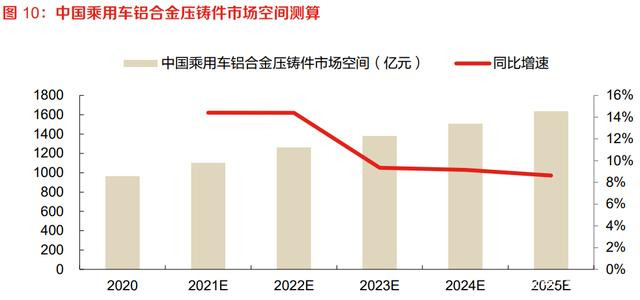 近年來國內熱成型等輕量化技術的發展迅速,國內零部件公司已具備成熟的熱成型技術能力,能 夠為國內外整車企業提供 AB 柱、防撞梁、保險杠等熱成型車身件,有望在車身輕量化的大趨勢 中受益。 2.3 增量領域:新能源汽車三電系統與一體化壓鑄部件 與傳統汽車相比,新能源汽車三電系統將導致整車重量增加,從而影響續航對于相同車型,三電系統將導致整車額外增加 200-300kg 的重量;同時新能源車輕量化系 數比傳統燃油車高 1.5-4 倍,意味著新能源汽車輕量化程度更低。三電系統通常占新能源汽車整 車重量的 30-40%,其輕量化是實現新能源汽車輕量化、提升續航的關鍵。 在新能源汽車三電系統中,電池包是重量最大的部分,約占整車重量的 18-20%,其中電池包殼 體(電池盒)約占電池包重量的 10-20%,是電池包中重量占比僅次于電芯的部件。在電池能量 密度提升逐漸進入瓶頸期后,電池盒輕量化成為新能源汽車的重點領域。 電池盒由上蓋和下殼體兩部分組成,目前電池盒上蓋主要材質包括沖壓鋼板、沖壓鋁板、SMC 等, 下殼體材質以鋁合金為主,按工藝可以分為擠出鋁型材攪拌摩擦成型、沖壓鋁板焊接成型及整體 鑄造成型等。當前階段兼顧性價比和輕量化效果的電池盒最佳輕量化方案是擠出鋁型材下殼體和 SMC 上蓋的組合,隨著碳纖維、鎂合金等材質的價格下降,電池盒輕量化方案有望迎來進一步優 化。 緊跟新能源汽車快速發展大潮,文燦股份、凌云股份、華域汽車等國內零部件廠商積極開發輕量 化電池盒產品并取得定點項目。除電池盒外,國內廠商在鋁合金電機、電控系統殼體以及混動汽 車變速箱殼體等領域也有相關布局。隨著新能源汽車產銷量及滲透率持續上升,三電系統輕量化 有望打開國內零部件廠商新增量空間。 在特斯拉的引領下,國內多家鋁合金壓鑄零部件公司開始布局一體化壓鑄技術,購入多臺巨型壓 鑄機用于車身結構件等領域的一體化壓鑄。一體化壓鑄具有流程簡便、生產效率高、輕量化程度 高等優點,隨著一體化壓鑄規模擴大,生產成本也將逐漸降低,預計未來將有更多整車企業采用 一體化壓鑄技術,一體化壓鑄滲透率有望持續提升。(報告來源:未來智庫) 3 行業市場空間及特性 3.1 行業市場空間較大 我們根據中國乘用車產量、乘用車單車用鋁量、鋁合金壓鑄件占汽車用鋁量比例以及車用鋁合金 零部件銷售價格,測算 2020-2025 中國車用鋁合金壓鑄件市場空間: (1)中國乘用車產量:2020、2021 年中國乘用車產量分別為 1999.41 萬輛及 2140.80 萬輛,據 中汽協預測,2022 年中國乘用車產量將達到 2300 萬輛,同比增長約 7.4%。2023-2025 年預計中 國乘用車產量增速將有所放緩,增速降至每年約 3%。 (2)中國乘用車單車用鋁量:2020 年中國乘用車單車用鋁量為 138.6 千克,預計 2025 年將提升至 187.1 千克,2020-2025 年復合增 速為 6.2%。 (3)鋁合金壓鑄件占汽車用鋁量比例:壓鑄件是汽車上應用最為廣泛的鋁合金形態,廣泛應用 于底盤、車身、動力系統等領域。據壓鑄雜志,壓鑄鋁合金約占汽車用鋁量的 77%。 (4)車用鋁合金壓鑄件銷售價格:據愛柯迪招股說明書數據測算,汽車鋁合金壓鑄件行業平均 售價約為4.52萬元/噸。由于鋁合金壓鑄件價格受鋁價波動影響較大,我們假設汽車鋁合金壓鑄件 平均售價始終維持不變。 根據以上數據測算,預計 2025 年中國乘用車鋁合金壓鑄件市場空間將達到 1637.14 億元,2020- 2025 年市場空間復合增速約為 11.2%,車用鋁合金壓鑄件市場前景廣闊。