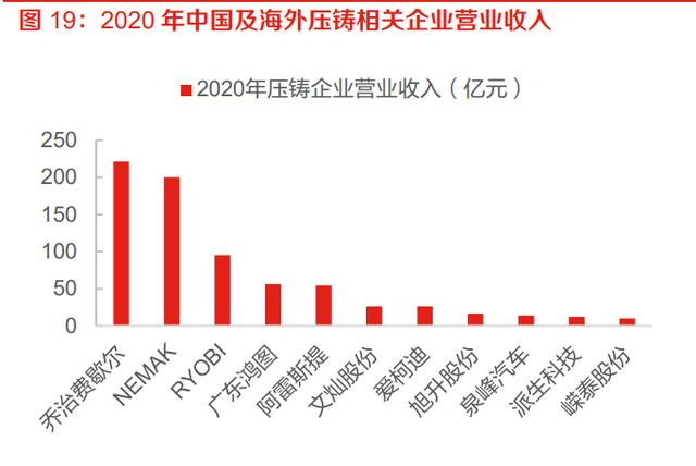 5 競爭格局:布局輕量化及一體化壓鑄自主供應商規模有望快速提升 我國輕量化壓鑄行業集中低,參與企業眾多,整體競爭較為激烈。根據文燦股份招股說明書, 2018 年我國壓鑄行業相關企業數量約 12600 家,其中生產壓鑄件的企業數量占比 70%以上,存 在各類不同生產規模的壓鑄件生產商,大部分供應商的輕量化壓鑄件產能較低。 外資或合資品牌的壓鑄件供應商數量較少,單個企業的規模大,專業化程度高,在資金、技術、 生產規模等方面具備優勢,領先于國內大多數供應商,通過在國內設立合資公司或子公司切入中 國市場,相關企業包括 NEMAK、RYOBI、阿雷斯提、皮爾博格、喬治費歇爾、DGS 等。 國內自主品牌的輕量化壓鑄供應商可分為兩類,一類從屬于下游的整車集團,依附于整車廠為相 關車企提供壓鑄件產品配套,包括長城汽車成立的壓鑄事業部、比亞迪旗下的弗迪精工等;另一 類是獨立的輕量化壓鑄件供應商,2018年國內壓鑄企業中大型壓鑄企業占比僅10%左右,少數國 內獨立供應商具備高質量的輕量化壓鑄產品及大型復雜模具的自制能力,能夠對客戶需求進行快 速反應和持續改善,已經與國內外知名車企建立了長期穩定的合作關系,具備一定實力,相關自 主供應商包括文燦股份、泉峰汽車、愛柯迪、拓普集團、旭升股份等。 從產品范圍看,大部分外資及合資品牌、自主品牌均在車身、傳動、底盤、轉向等多個系統領域 布局,涉及的輕量化壓鑄件產品包括變速器殼體、電機殼體、支架、缸體、缸蓋等。 從各壓鑄企業相關客戶看,外資及合資品牌中 RYOBI、阿雷斯提等日系供應商更多與日系車企進 行合作,例如阿雷斯提與豐田、日產、本田、鈴木等合作配套;而皮爾博格、DGS、喬治費歇爾 等歐美供應商更多為奧迪、寶馬、奔馳、大眾、通用等歐美車企配套壓鑄產品;國內自主供應商 配套客戶眾多,客戶范圍涉及美系、日系、歐系、自主車企等,例如嶸泰股份的客戶包括大眾、 奧迪、寶馬等外資品牌,也包括長城、吉利、比亞迪等自主品牌;旭升股份為特斯拉、理想、蔚 來、零跑等眾多新勢力配套壓鑄件。 從全球壓鑄件企業營業收入看,外資壓鑄企業的收入規模相對較高,國內大部分壓鑄企業與國外 企業規模上存在差距。具體來看,營業收入較高的幾家頭部壓鑄企業分別是喬治費歇爾、 NEMAK、RYOBI 等,2019 年喬治費歇爾、NEMAK 營業收入超過 250 億元,2020 年受疫情影響 收入有所下滑,但仍超過 200億元,綜合競爭力強;國內大部分壓鑄企業的收入規模均在 30 億元 以下,與外資企業差距明顯,國內營業收入較高的企業包括廣東鴻圖、文燦股份、愛柯迪等,國 內各壓鑄企業擴產,通過性價比優勢獲取更多新訂單,布局一體化壓鑄等新技術,逐步縮小與外 資壓鑄企業的差距。