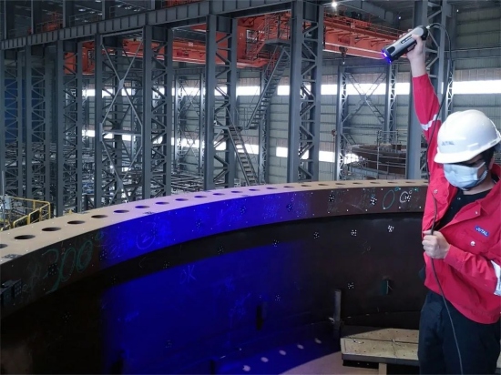 將管道缺陷處三維模型記錄于管道檢測歷史模型庫中,便于后續(xù)比對分析管道缺陷情況以及預(yù)測缺陷的發(fā)展演變趨勢,從而更加精準(zhǔn)地進(jìn)行管道缺陷風(fēng)險(xiǎn)評價(jià)以及剩余壽命估算。 該項(xiàng)目設(shè)備已在浙江省天然氣省網(wǎng)中得到應(yīng)用,并得到客戶的高度認(rèn)可,顯著降低管道外表面缺陷測量評價(jià)成本,減少了企業(yè)在人力、物力成本以及時(shí)間上的投入。 4.海上風(fēng)電大型法蘭盤檢測 思看科技為某大型海上工程裝備制造企業(yè)提供定制化三維檢測方案:KSCAN+MSCAN全局?jǐn)z影測量系統(tǒng),對海上風(fēng)電導(dǎo)管架進(jìn)行測量,從源頭把控導(dǎo)管架生產(chǎn)質(zhì)量,提高生產(chǎn)效率。