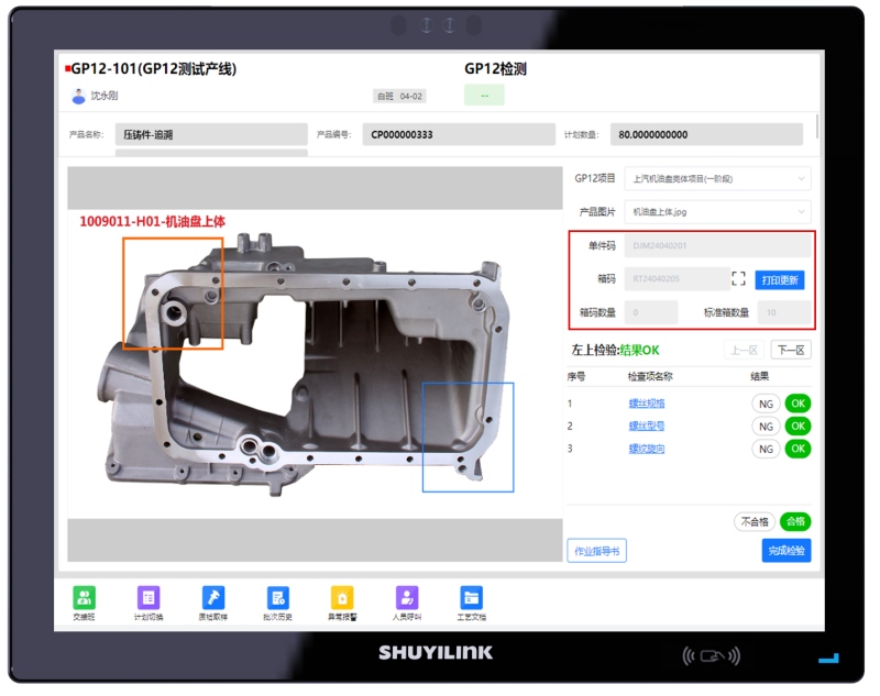 GP12產線終端界面(適用單件產品) 當檢測合格數量達到產品標準箱數量時,會自動觸發箱碼打印,同時支持二次檢驗、不滿箱打印,產品換箱等多種使用場景,基本覆蓋了客戶對GP12系統流程的所有要求。【適用范圍:單件管理的產品】