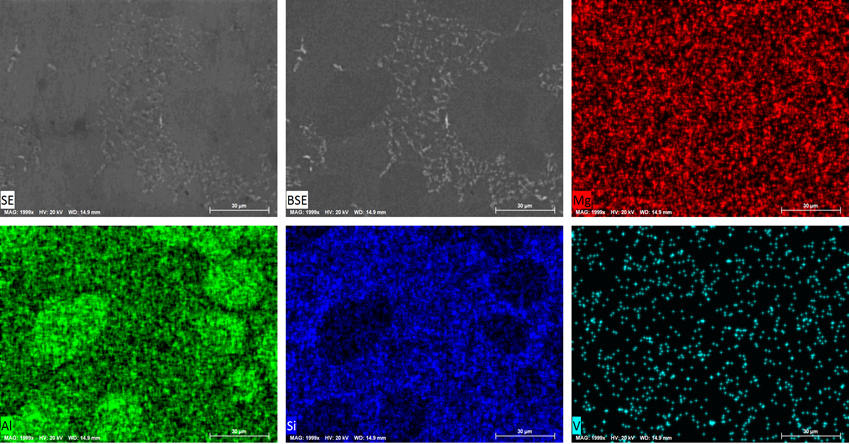金相顯微鏡組織形貌 壓鑄后基體組織主要為尺寸細(xì)小且彌散分布的α-Al(白色顆粒)和共晶Si相(灰黑色區(qū)域),共晶Si呈纖維狀,無尺寸粗大的第二相,JY-1合金具有較高的強(qiáng)度和韌性。 3、掃描電鏡組織形貌及能譜分析數(shù)據(jù):